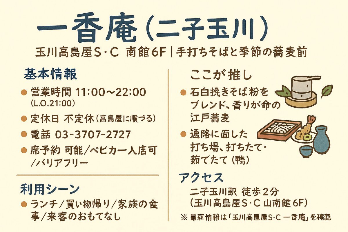 香り立つ手打ちそばの世界へ──🌿 玉川高島屋S・C南館6階「一香庵」で、石臼挽きそば粉の香りと打ちたて・茹でたての江戸蕎麦を堪能。 昼は軽やかに、夜は蕎麦前で一杯。二子玉川の隠れた和の名店です 👉 詳しくはこちら futakotamagawa.tokyo/%e4%b8%80%e9%a… #二子玉川 #田園都市線 #一香庵 #玉川高島屋 #そば pic.x.com/e24DuudETH