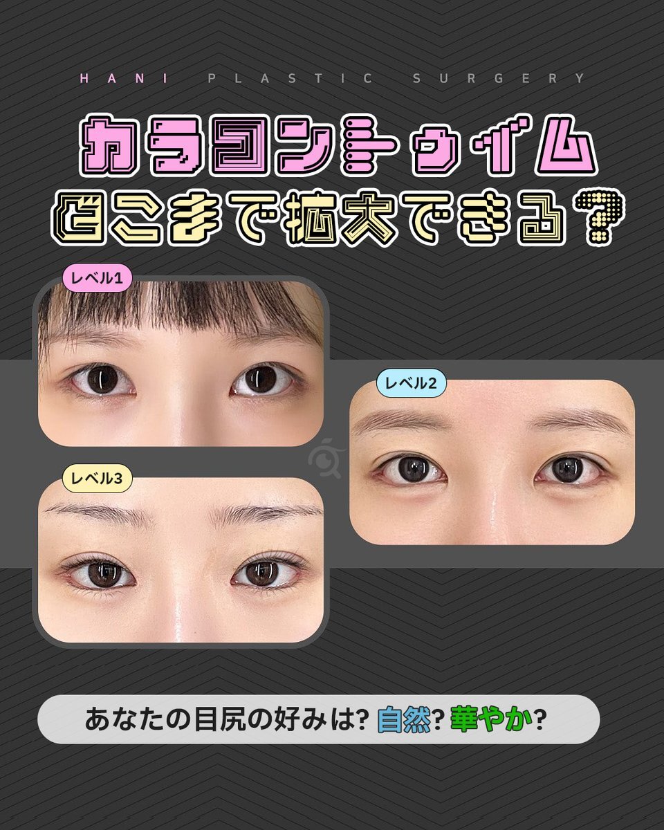 好みによって白目拡大範囲を調節できます✨ あなたの好みは?レベル1~3番から選んで❣ ⭐カラコントゥイム=目尻切開+タレ目形成⭐ 2つの手術を同時に行う韓国・日本人気の手術🩷 目の横幅を長くしながら目の下を下げ三角の形を維持しながら白目を拡大する手術になります💯 x.com/hanips_jp/stat…