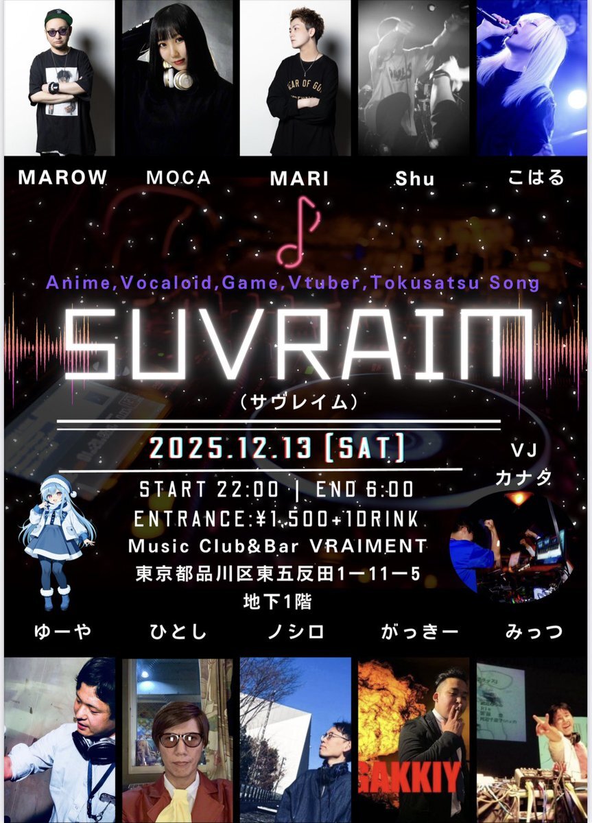 【告知】 SUVRAIM(サヴレイム) 12/13(土) 22:00〜6:00 五反田Vraiment entrance:¥1,500+1D 普段は洋楽やk-pop中心に流れるお店で今回初のアニソン中心のサブカルDJイベントをやります‼️ 🎧DJ's ・MAROW ・MARI ・MOCA ・Shu ・こはる ・がっきー ・ノシロ ・ひとし ・みっつ ・ゆーや 📺VJ ・カナタ