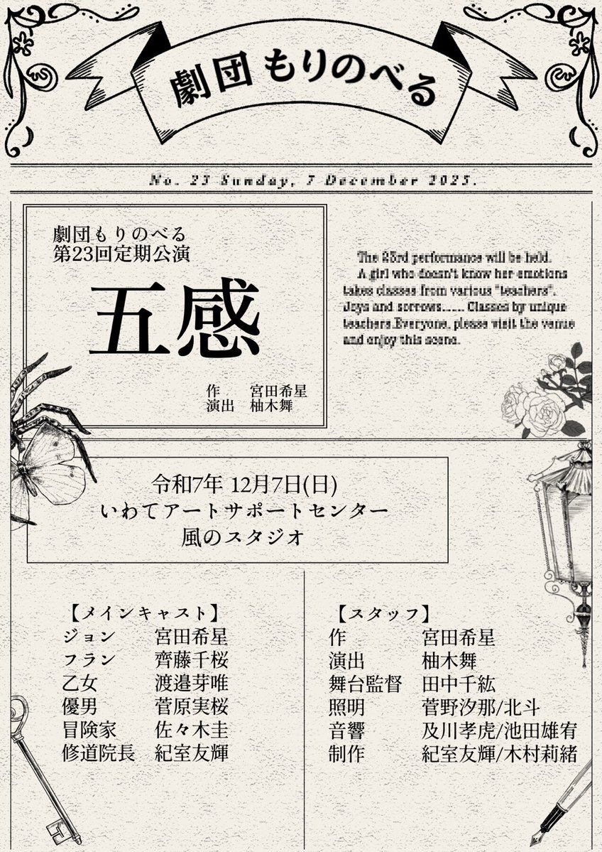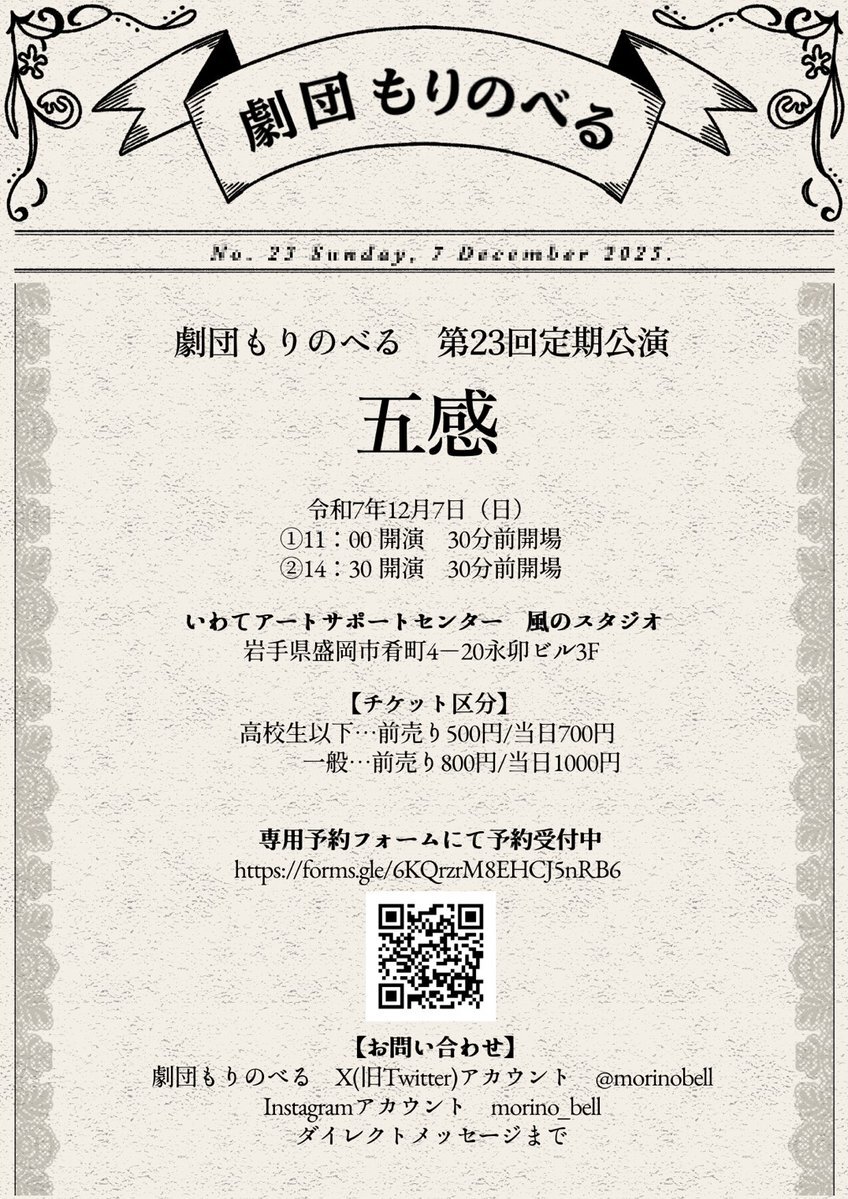 🔔公演情報🔔 第23回定期公演『五感』 日時:2025年12月7日(日) 午前:11:00開演(30分前開場) 午後:14:30開演(30分前開場) 会場:いわてアートサポートセンター 風のスタジオ --ご予約はこちらから-- forms.gle/6KQrzrM8EHCJ5n… #劇団もりのべる #五感 pic.x.com/WPh88xJaGD