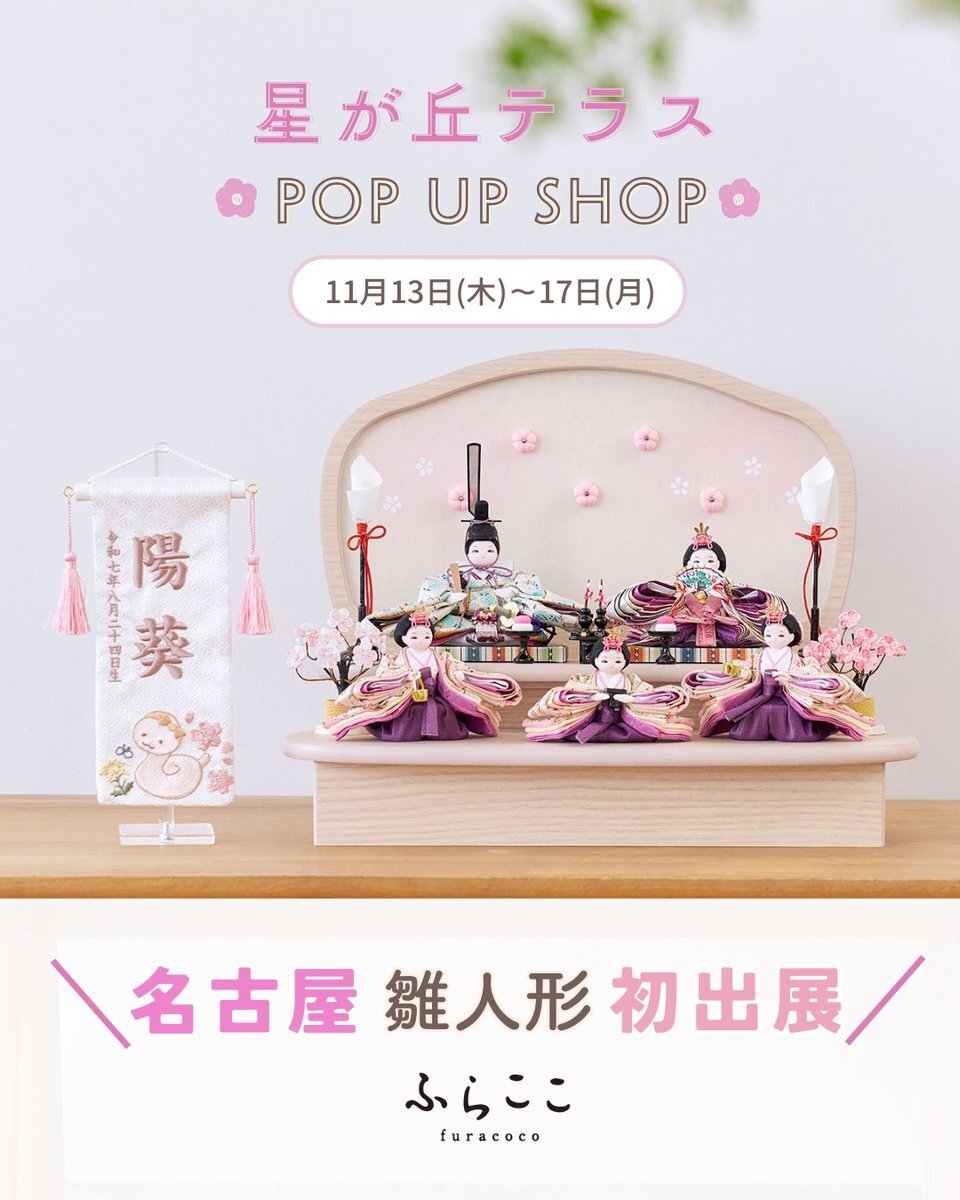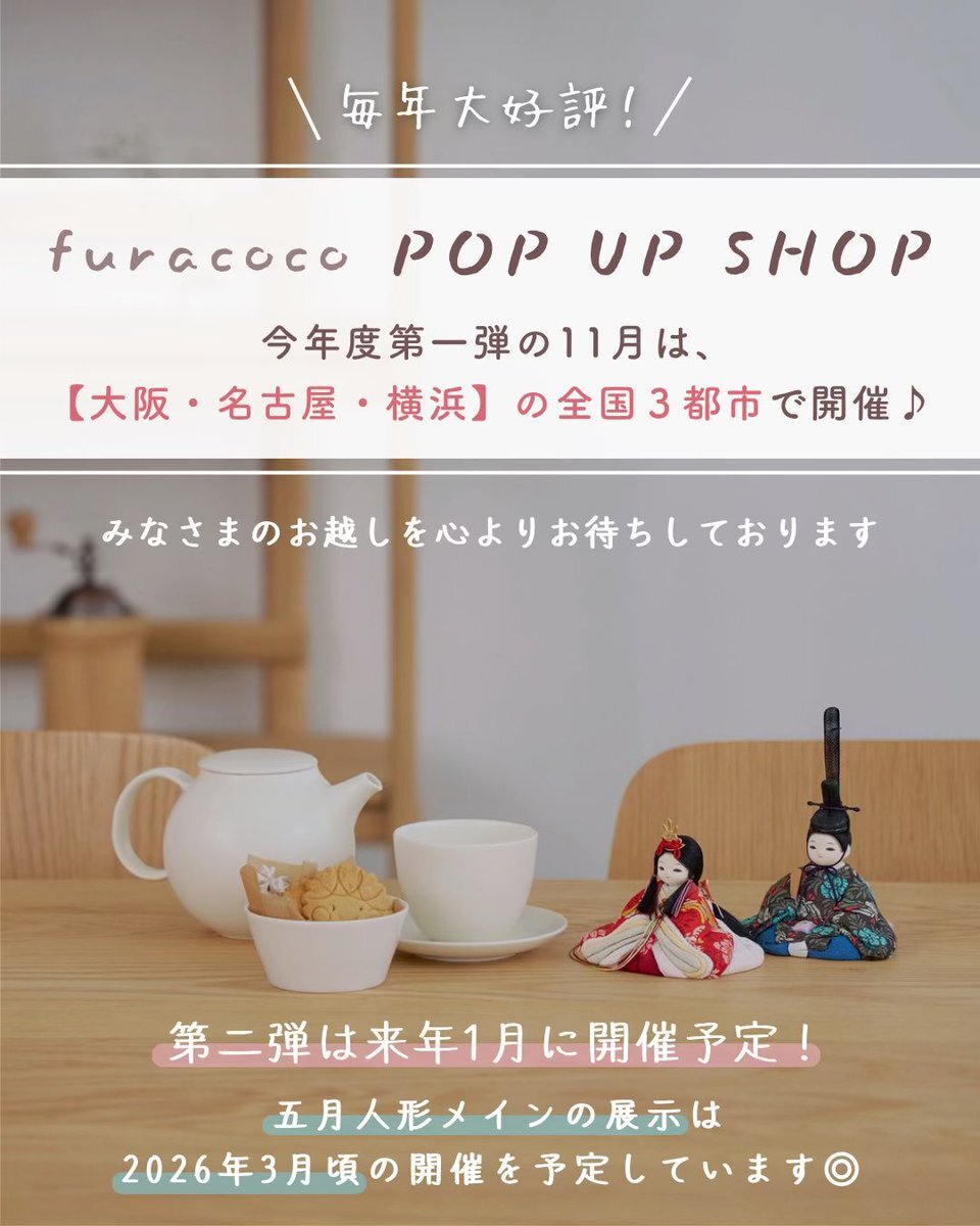【POP UP情報】 11/6(木)~の大阪を皮切りに 各地でのPOP UP SHOPを開催いたします🏠 ぜひ、各地の皆さまの大切なお人形選びに ご一緒させていただけますと幸いです♪ 詳しくはこちらから🎎🎏 furacoco.co.jp/store/ #ふらここ #雛人形 #五月人形 #初節句 pic.x.com/Cw5fxFfLfi