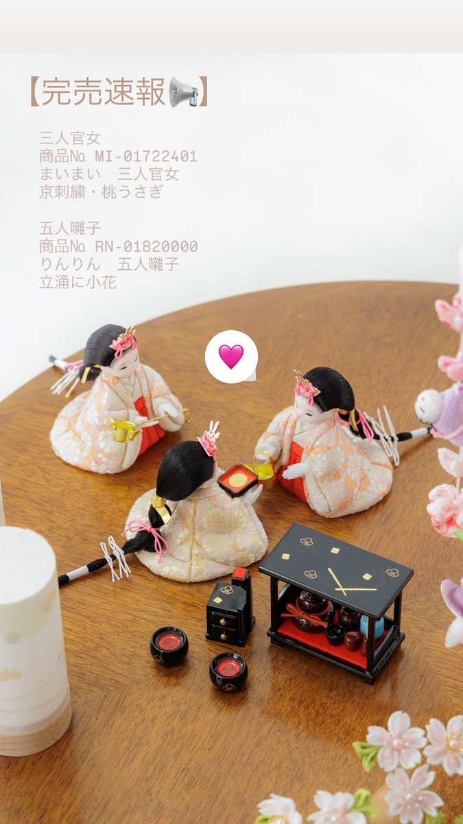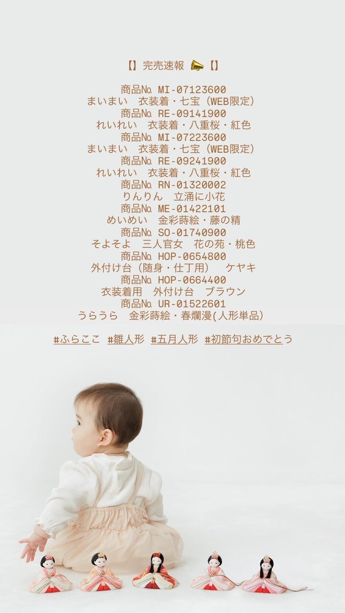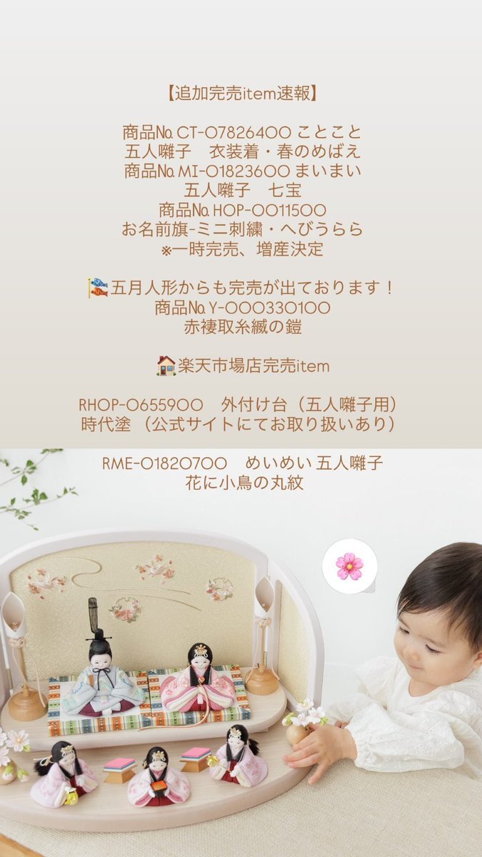 完売速報📢 例年、販売開始から数日間は 沢山のお客様に雛人形・五月人形を お迎えいただいております。🌸 お気に入りitemの完売にも お気をつけください🌱 furacoco.co.jp/hina/soldout/ #ふらここ #雛人形 #五月人形 #初節句 pic.x.com/lB82ZWVVdh