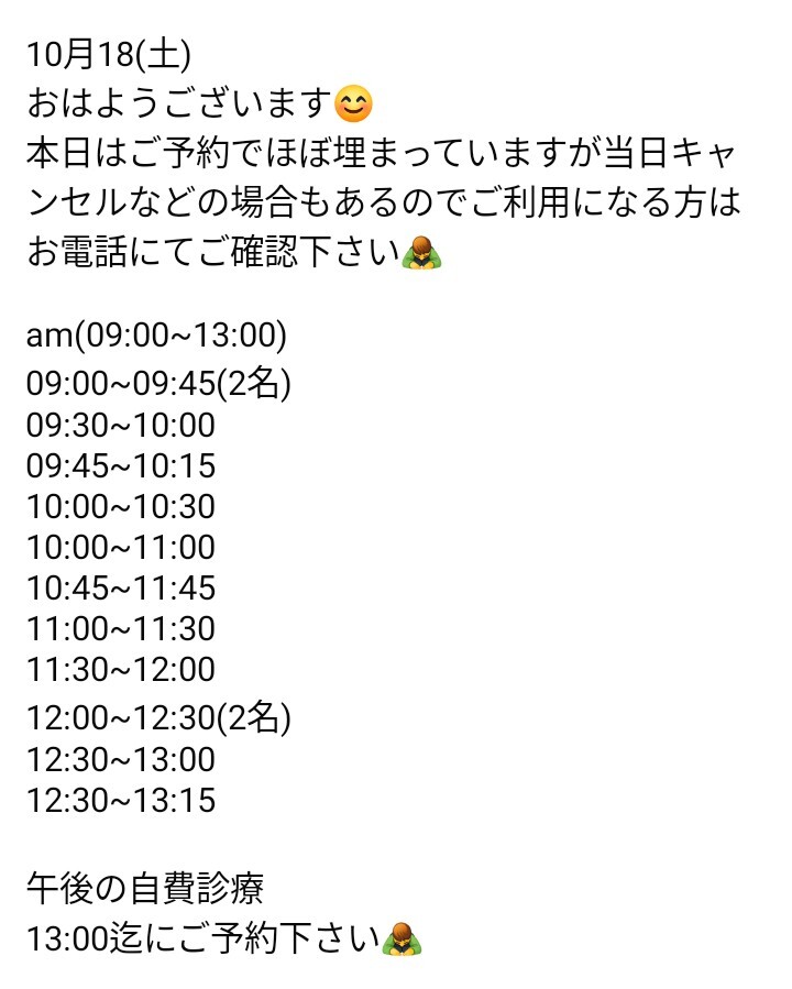 【予約状況】 10月18日(土)  本日は予約がいっぱいです。 10月20日(月)14時00分~15時00分に空きがございます。 ご予約はお早めに! res.locaop.jp/a/fullcare/sho… #フルケア鍼灸整骨院 #狛江市 #肩こり改善 #腰痛改善 #交通事故 #鍼灸 #整体 #美容鍼 #ダーマローラー