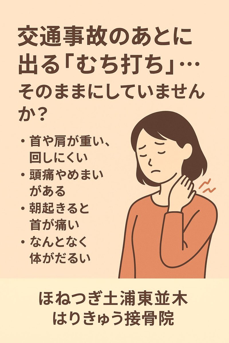 交通事故後のむち打ちそのままにしてない?💥 数日後から首・肩の重だるさ、頭痛、めまいが出ることも⚡ 当院はやさしい施術で改善をサポート✨ 自賠責保険で窓口負担0円まずはご相談を💬 #茨城 #土浦 #接骨院 #交通事故 #自賠責 #むちうち pic.x.com/8gZo4QPAgd