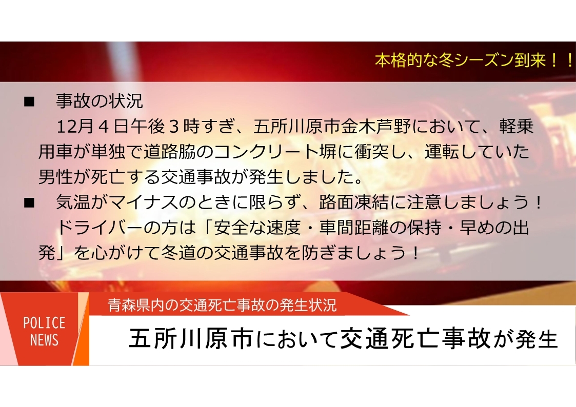 【交通死亡事故発生】 12月4日午後3時すぎ、五所川原市で軽乗用車が単独でコンクリート塀に衝突し、運転していた男性が死亡する交通事故が発生! ドライバーの方は「安全な速度・車間距離の保持・早めの出発」で冬道の事故防止を! #交通事故 #五所川原 #青森県警察 pic.x.com/2e0GOrZL8B
