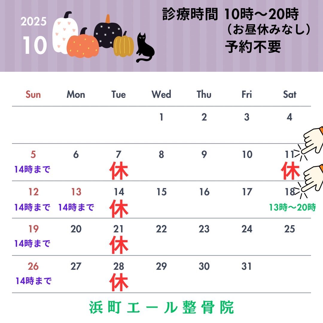 ビバモール本庄2階の浜町エール整骨院です☀️ 10月18日(土)は13時〜20時まで診療致します! 予約不要ですので、ギックリ腰、寝違え、頭痛など、急な不調にも当日対応可能です🙂 お気軽にご来院下さい😊 #交通事故 #ムチウチ #骨盤矯正 #整体 #ウォーターベッド #ヘッドスパ pic.x.com/OPXnLYiFUT