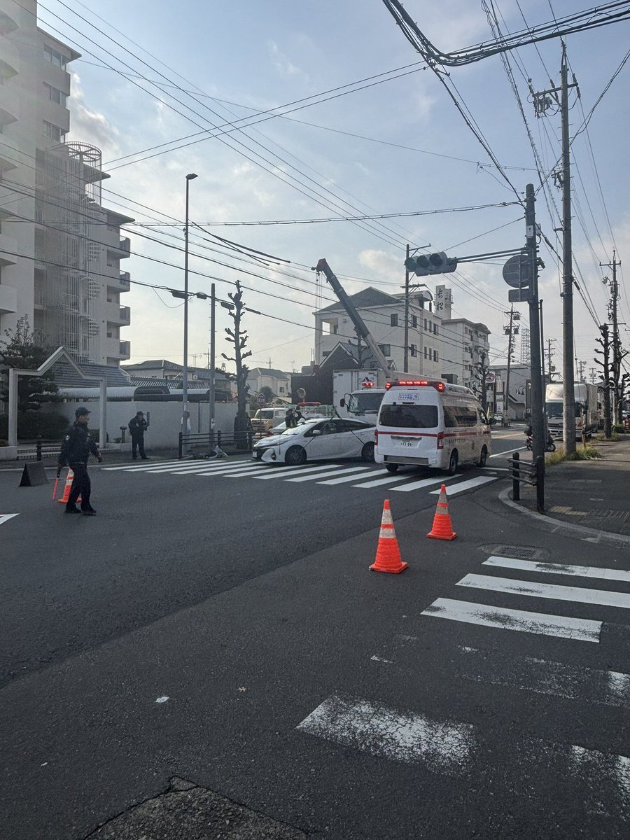 事故だね わーわー騒いでいる高齢者いるけど、あの人か? まさにプリウスミサイルだな 警察は来てるけど救急車より先にレッカー車来て事故車を釣り上げようとしている 現場検証は? #通行止め #交通事故 pic.x.com/WpnU4hX0dp