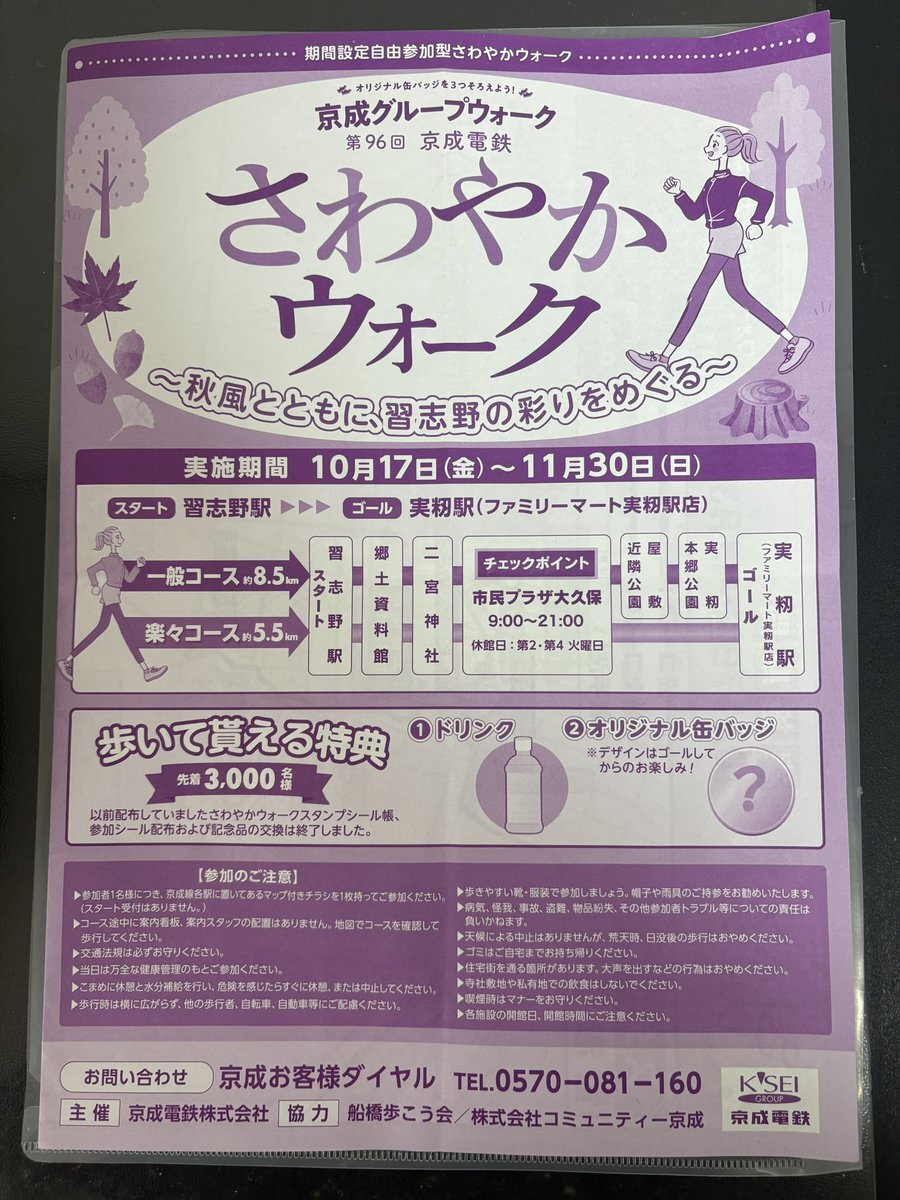 今日はここからその2。 クレイジー企画とはウォーキングのハシゴでした。 地元のさわやかウォーキンgいやさわやかウォークをしてきます。 時間は決まっていませんがゴールのドリンク引換が18時までなのでそこがリミットと考えております。 #さわやかウォーク #京成 #習志野 pic.x.com/s9ejRfGQDU