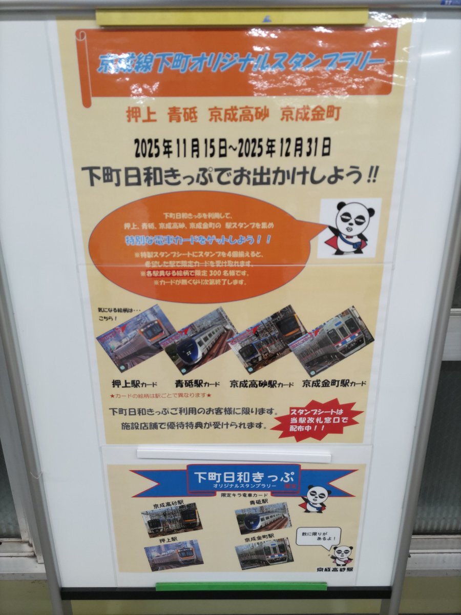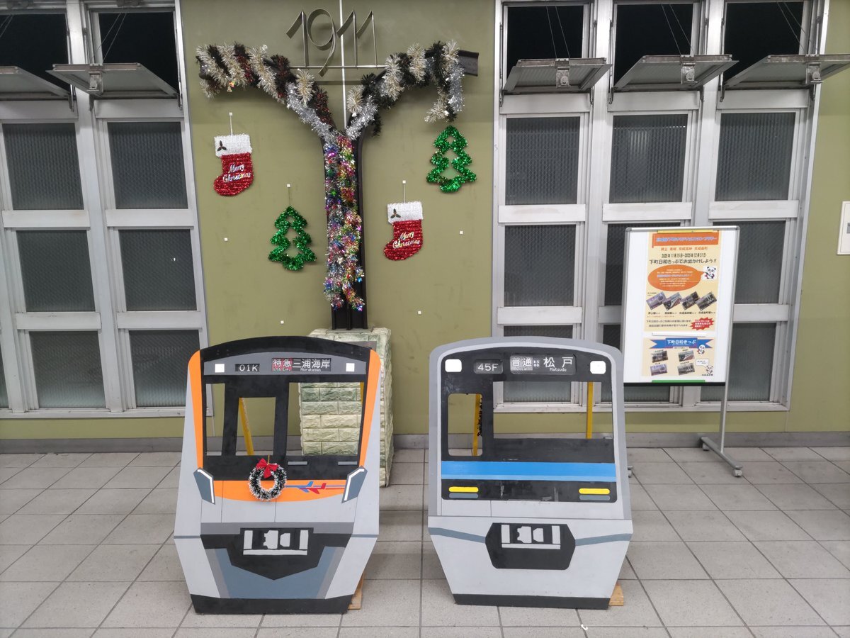 駅のフォトスポット。3100形にヘッドマーク風のクリスマス飾りが。そして周辺の押上、青砥、京成金町の各駅と共同で開催中のオリジナル企画のポスターです。#京成高砂 #京成 pic.x.com/7LYjZH6kMX
