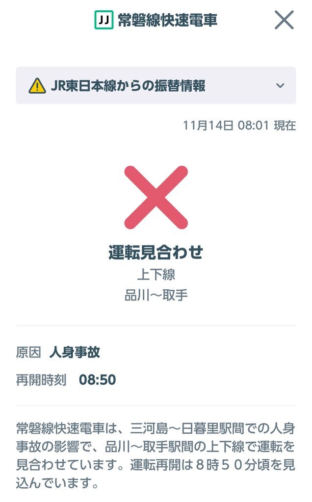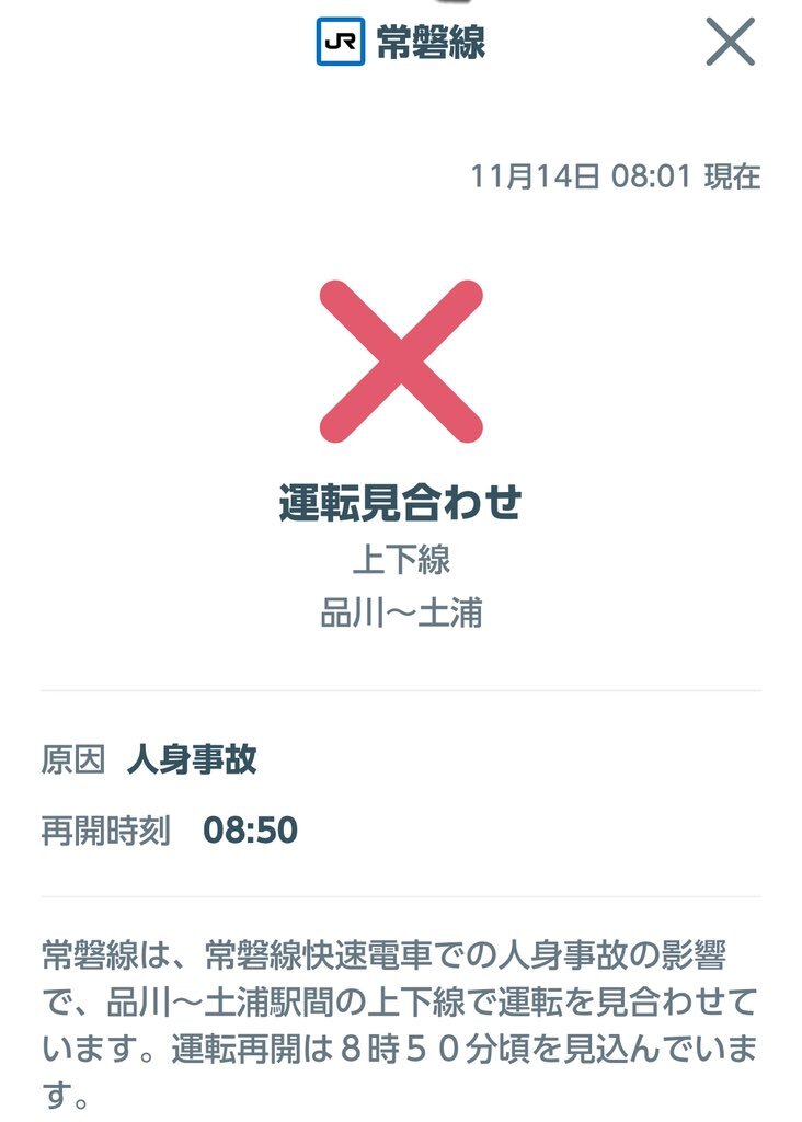 鉄道運行情報 常磐快速線 運転見合わせ 原因:日暮里〜三河島駅間人身事故 再開見込み:8時50分 この影響で成田線(我孫子支線)の一部列車に遅れや運休、行先変更が発生しています。 常磐線各駅停車は運転しています。 #鉄道運行情報 #交通情報 #成田市 #JR #京成 pic.x.com/wRxsWs5BEC
