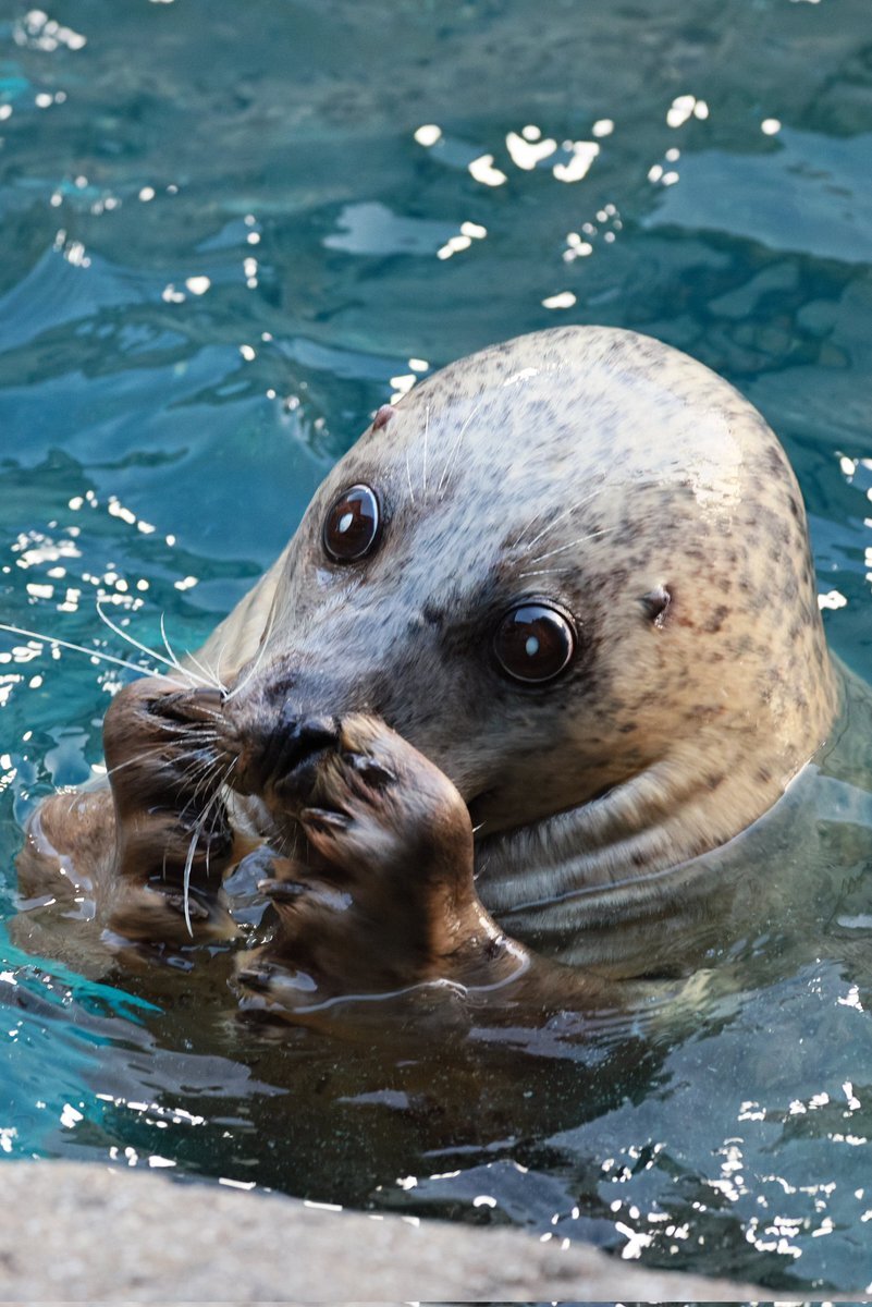 ハマちゃん🦭👀 恥ずかしいポーズ?お願いポーズ? #ハマ #京都水族館 #ゴマフアザラシ #アザラシ pic.x.com/nJqm2msCNb