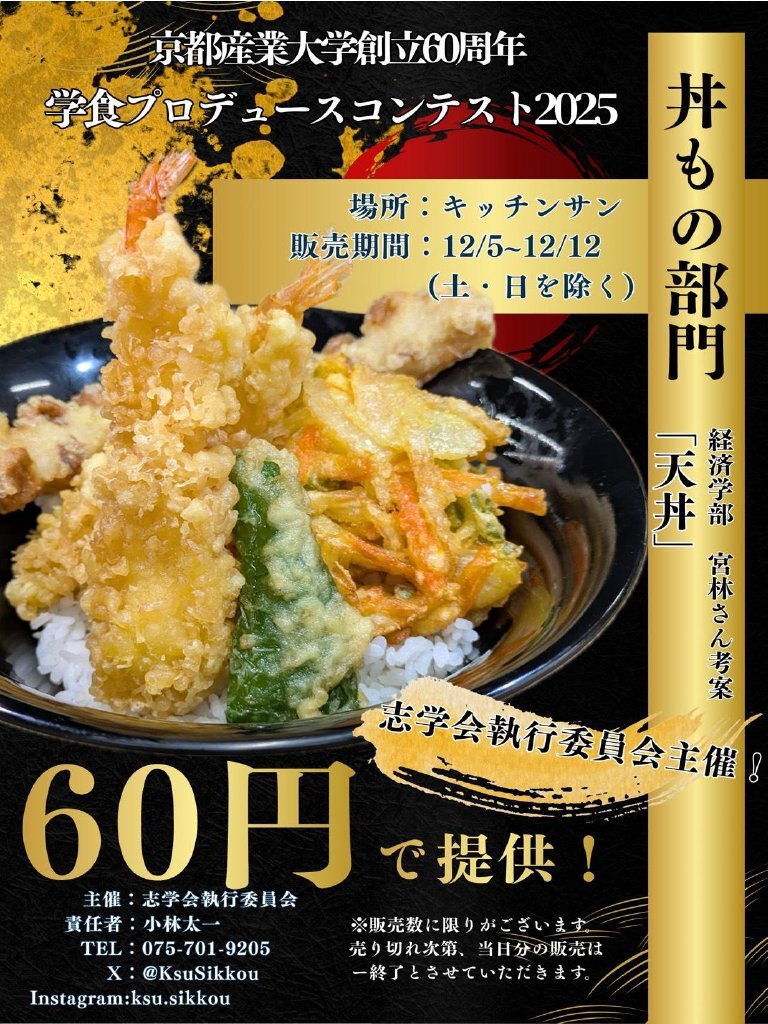 【本日最終日!】 志学会執行委員会主催! 学食プロデュースコンテスト2025 〜京都産業大学創立60周年〜 本日が最終日です!🔥🔥🔥 価格:60円 販売期間:12/5〜12/12 みなさん是非食べに来てください!🔥 #志学会執行委員会 #京都産業大学 pic.x.com/F1jUxeUs8g