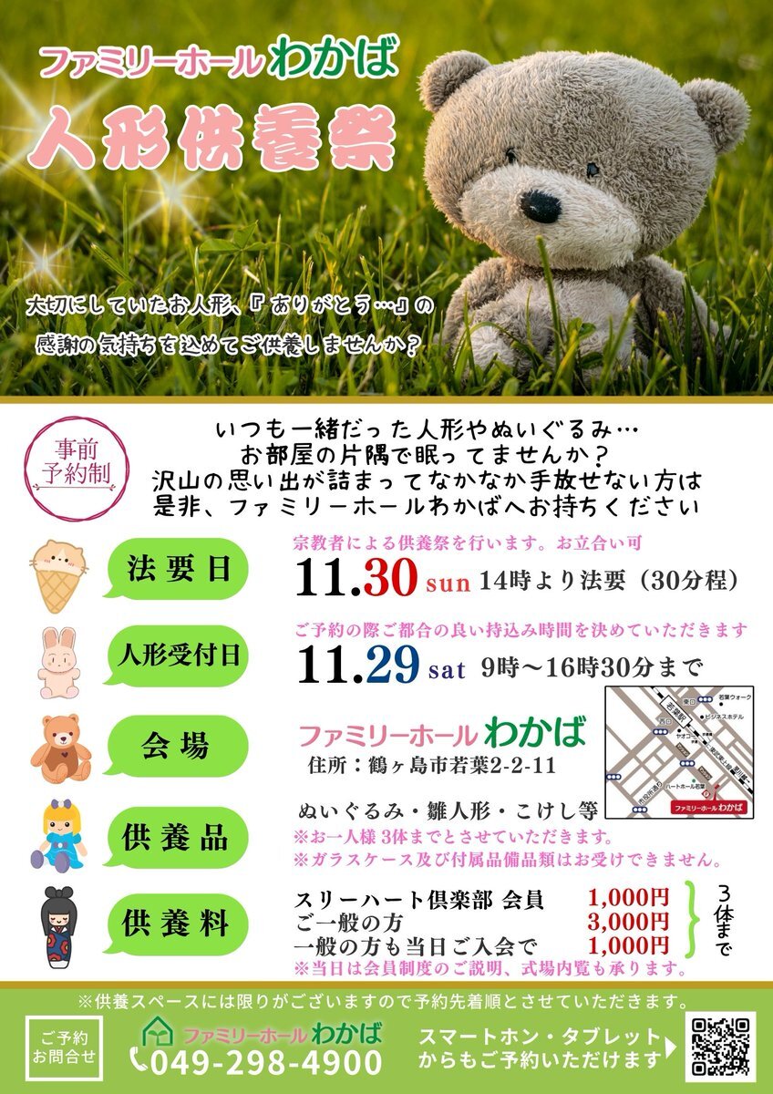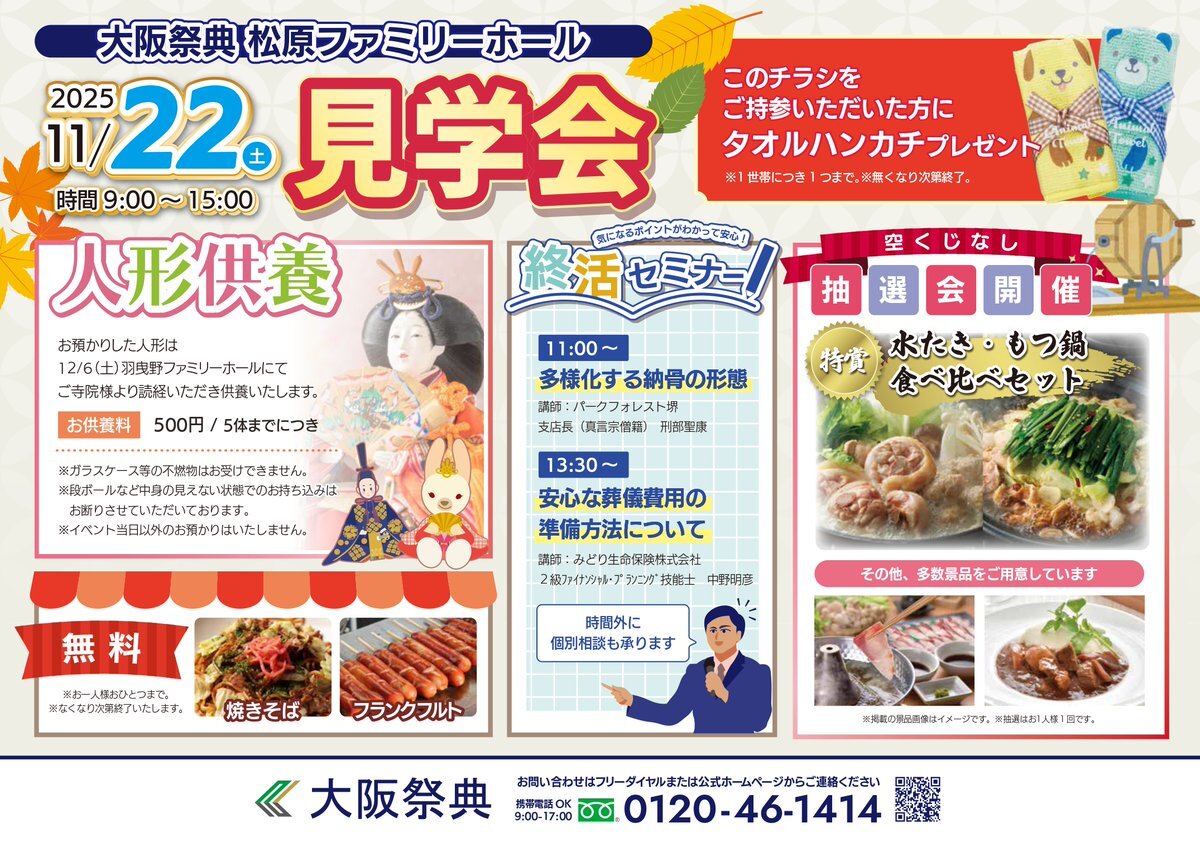 【11/22(土) 9:00〜15:00】#松原ファミリーホール 見学会 ・人形供養5体:500円 ・無料屋台(やきそば/フランクフルト) ・終活セミナー(納骨/葬儀費用) ・抽選会あり✨ ご来館お待ちしております。 #大阪祭典 #人形供養 #家族葬 pic.x.com/Qq34yhjFPy