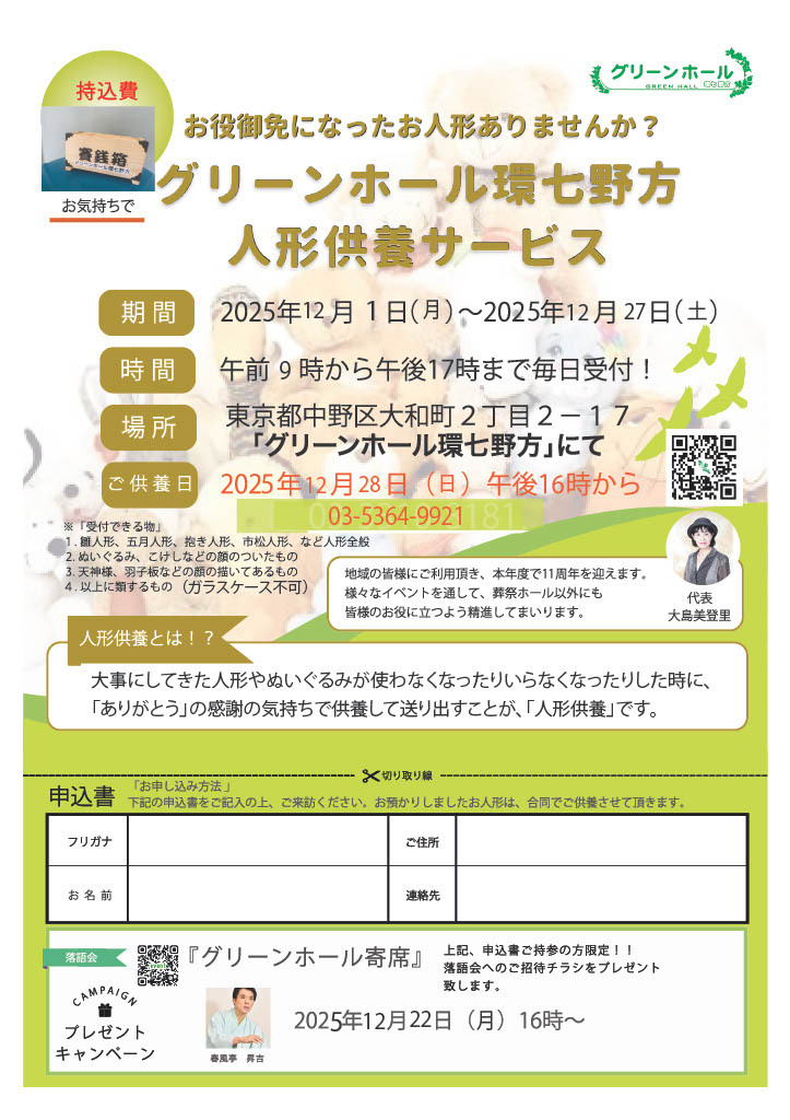 グリーンホールでは年末に人形供養祭を開催いたします🍀 ご自宅に眠ったままのお人形・ぬいぐるみはいませんか?お預かりしてご供養させていただきます。 #人形供養 #供養 pic.x.com/e47ePtTWBI