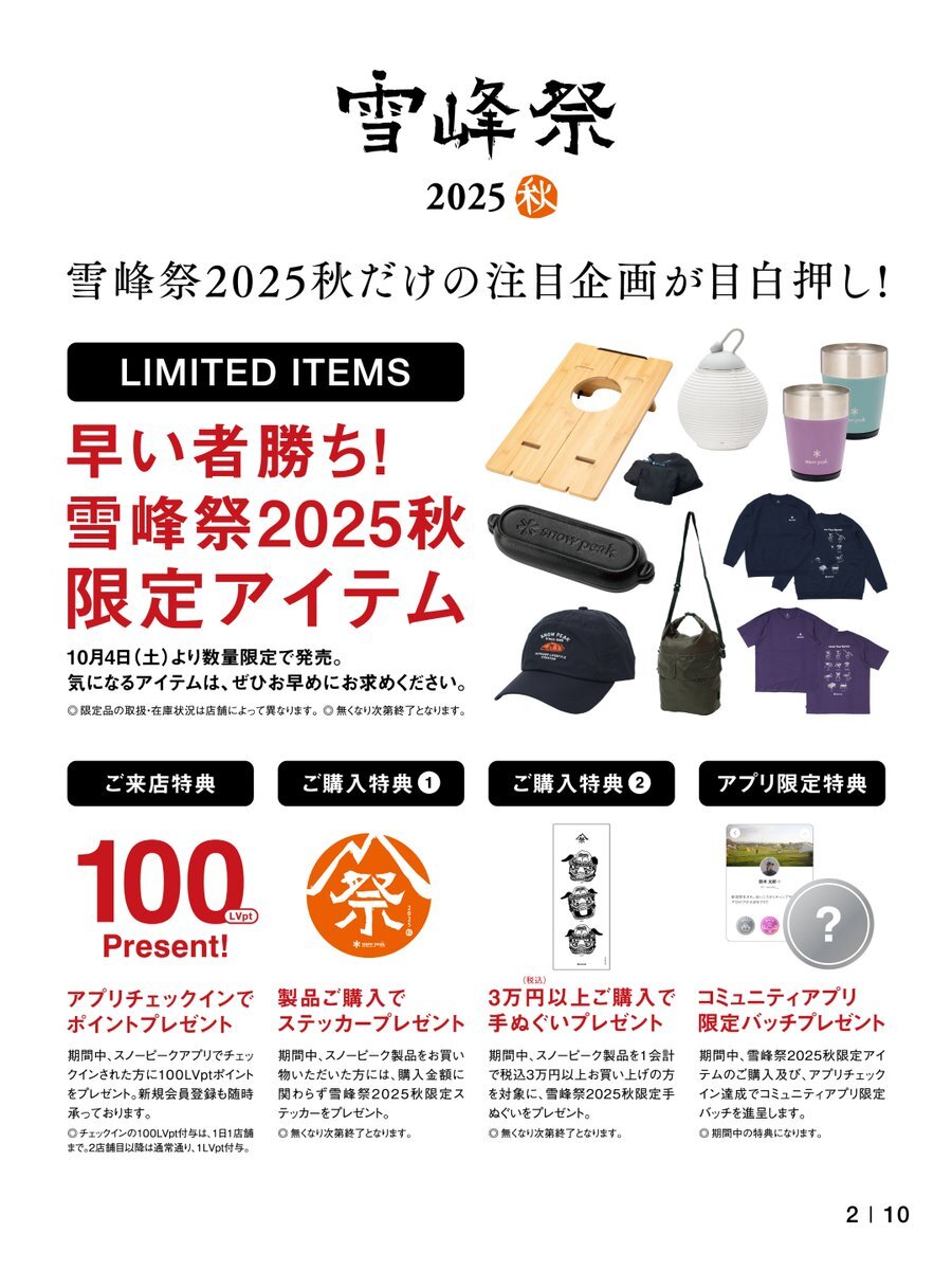 恒例の!#雪峰祭2025秋∧(`•ω•´)∧2⁺˳5✧*。 2025/10/4(土)5(日)に皆さまへの感謝の気持ちを込めて開催する #スノーピーク#感謝祭🥰 #限定アイテム をご用意して8階 #ビックアウトドア でお待ちしてます😊 #snowpeak #雪峰祭 #人生に野遊びを #camp #限定品 #キャンプ #アウトドア pic.x.com/254Gn0tgsI