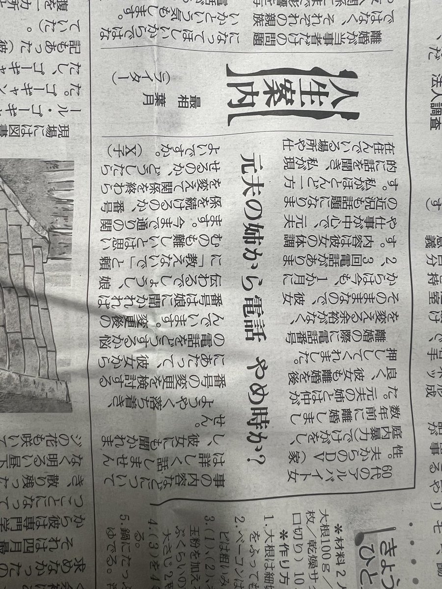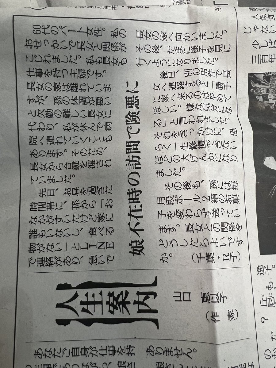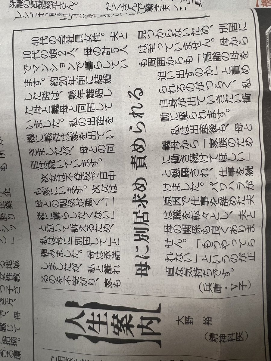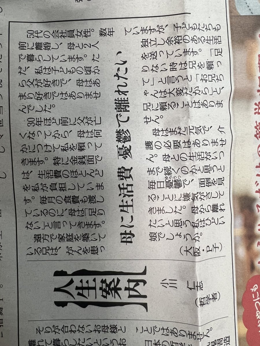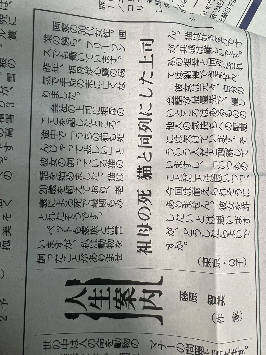 #人生案内 #読売新聞 私は職場の食堂で昼食時、母親の介護の大変さを話してたら同僚が「うちも大変なんだよ!」と言うので、てっきりそいつの親のことだと思ったら、飼ってる老猫の事だったのです。 この投稿者と同じで「俺の母親と同列にすんじゃねえよ‼️😡」と言いたかったですが腹の中に収めました pic.x.com/GorBVR2twR