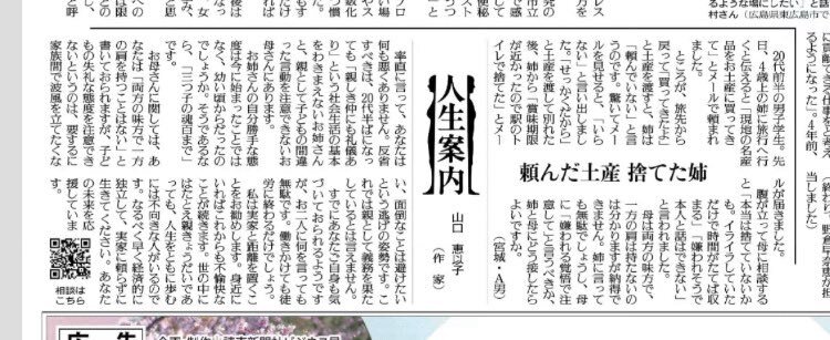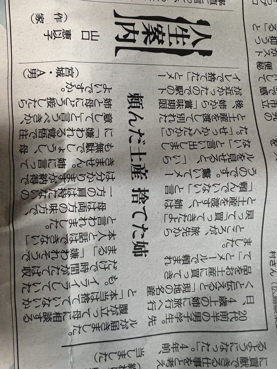きょうの #人生案内 は20代の男子学生の相談。姉に頼まれ土産を買いましたが、姉は「頼んでいない」と言います。それでも渡すと「駅のトイレで捨てた」とメールが届きました。母に相談すると注意できないと言います。姉と母にどう接したらよいですか。 #悩み相談 #読売新聞 yomiuri.co.jp/jinsei/2025122…
