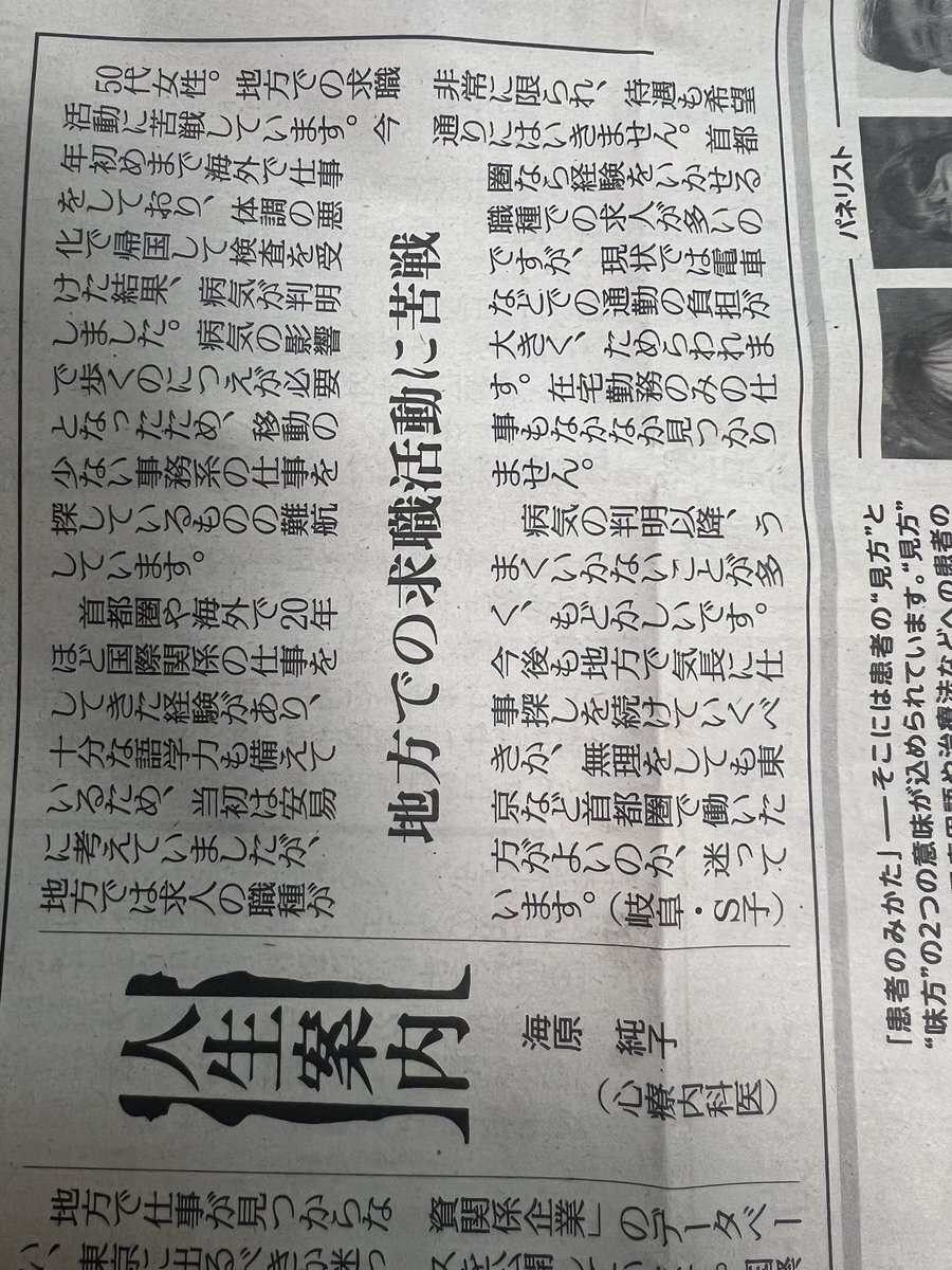 きょうの #人生案内 は50代女性からの相談。地方での求職活動に苦戦しています。長年海外などで国際関係の仕事をし語学力もありますが、地方での求人は職種が非常に限られ、待遇も希望通りではありません。今後も地方で職探しを続けるべきでしょうか。x.com/jinsei_annai #悩み相談 #読売新聞