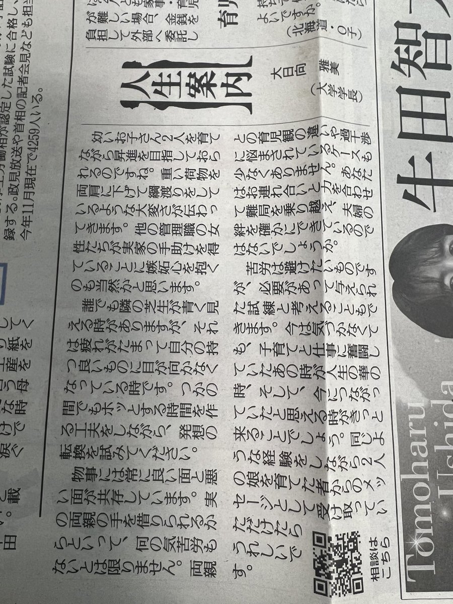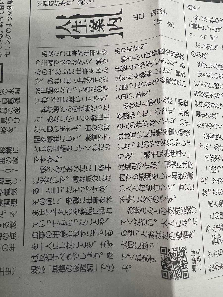 わたしも実家が福岡で、東京に住んでいた時同じように感じたことありました。でも自転車の前後に2人、おんぶ1人した3人のママが3箇所違う保育園に送っている姿を見て、頑張ろうと思う日々でした。 #人生案内 pic.x.com/peFXC5tR1Y
