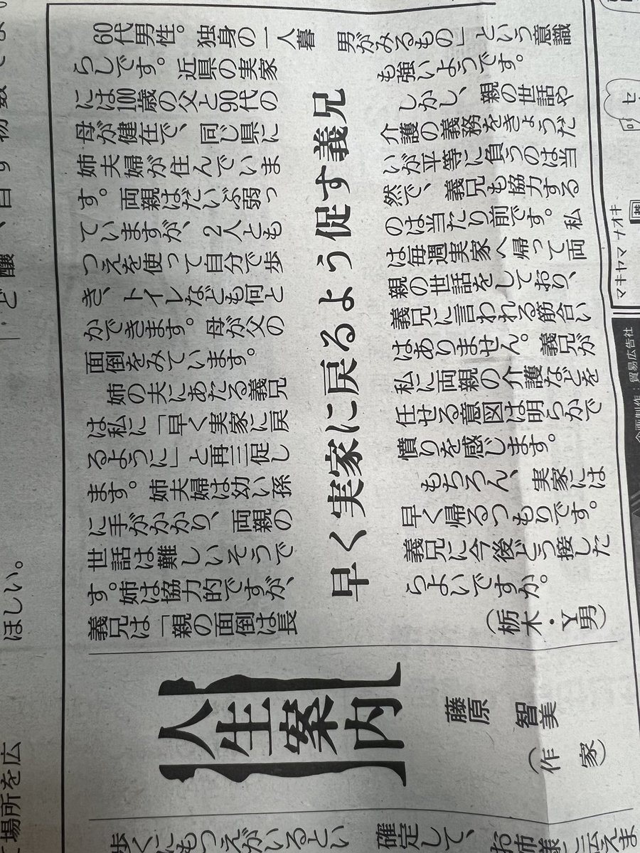 きょうの #人生案内 は60代男性からの相談。近県の実家には100歳の父と90代の母が健在で、母が父の面倒を見ています。義兄は私に「早く実家に戻るように」と促しますが、私に両親の介護を任せる意図は明らかで憤りを感じます。どう接したらよいですか。 #悩み相談 #読売新聞 yomiuri.co.jp/jinsei/2025122…