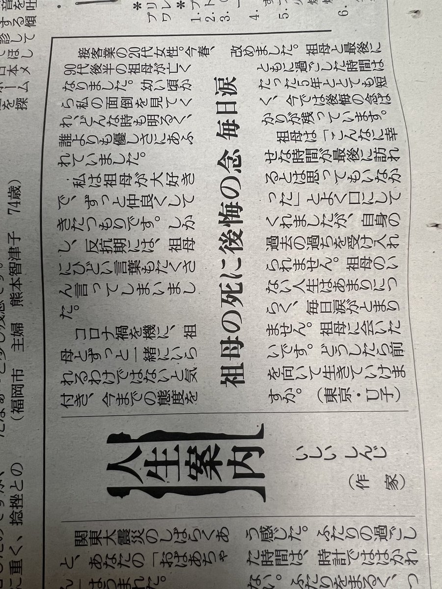 きょうの #人生案内 は20代女性からの相談。今春90代の祖母が亡くなりました。明るく、優しい祖母が大好きでしたが、反抗期にはひどい言葉もたくさん言いました。自身の過ちを受け入れられず、涙が止まりません。どうしたら前を向いて生きていけますか。 yomiuri.co.jp/jinsei/2025121… #悩み相談 #読売新聞