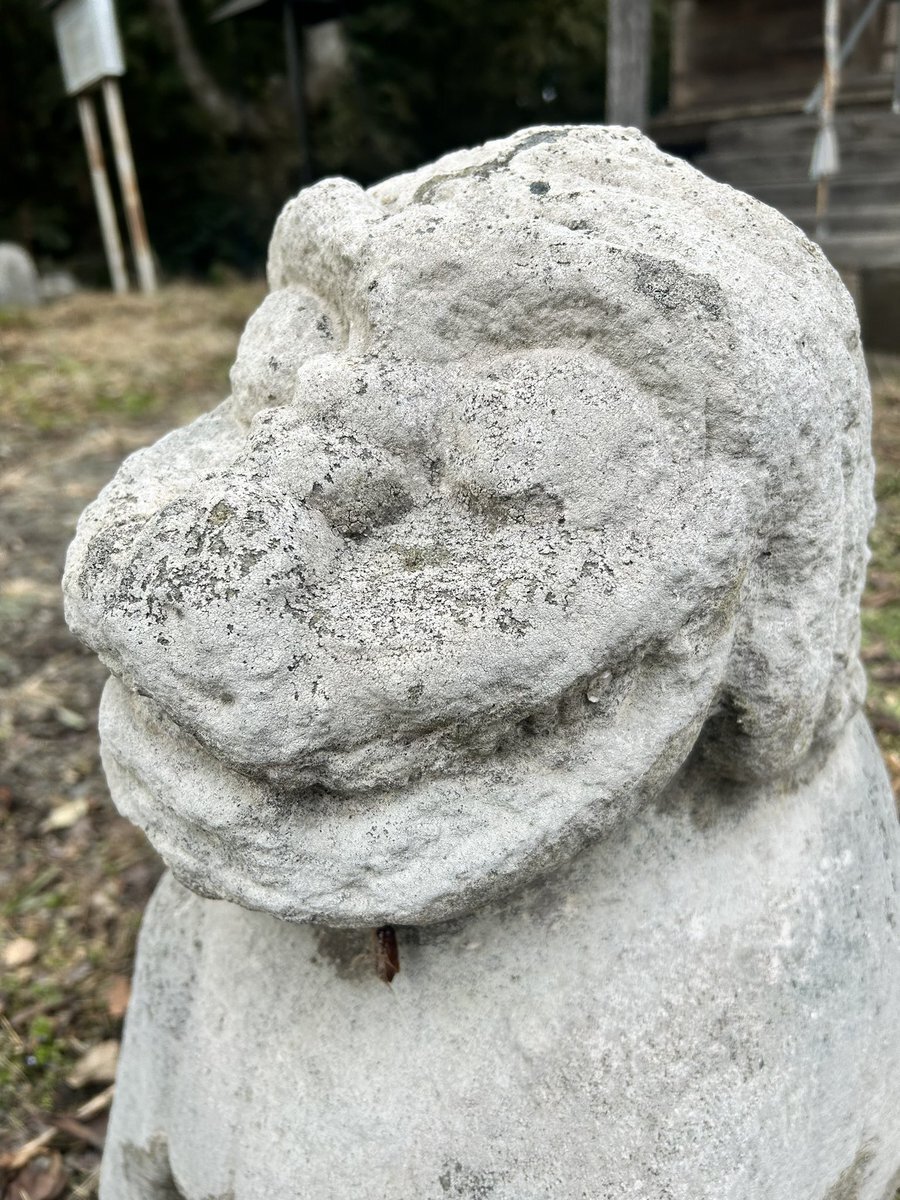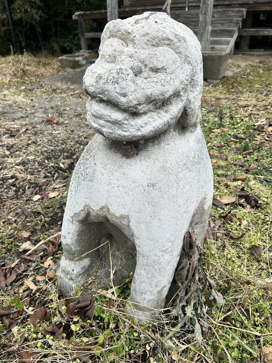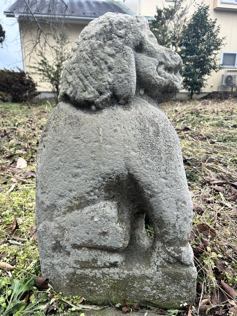健在なほうの狛犬さん。阿像と見てよろしいだろう。両前脚は前後していないけれど、腹の下はくり抜かれていない。耳は垂れて、鬣は髪の毛のよう。ゲジ眉で目は飛び出る。身をスックと立てるけれど、前傾姿勢でも胸を張るでもないお姿は、仙台狛犬っぽいと見える。 #今日のいしぶみ pic.x.com/DqyFE8rvuY
