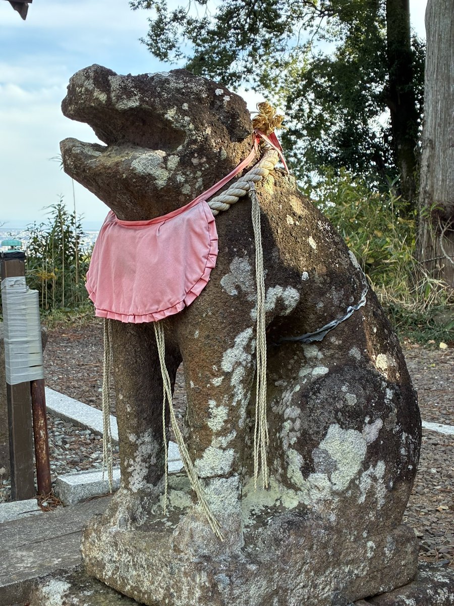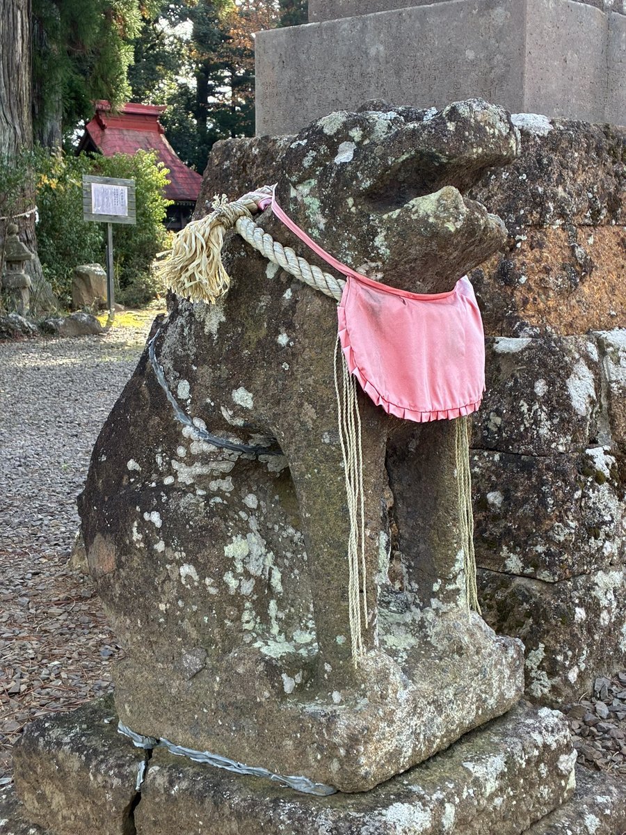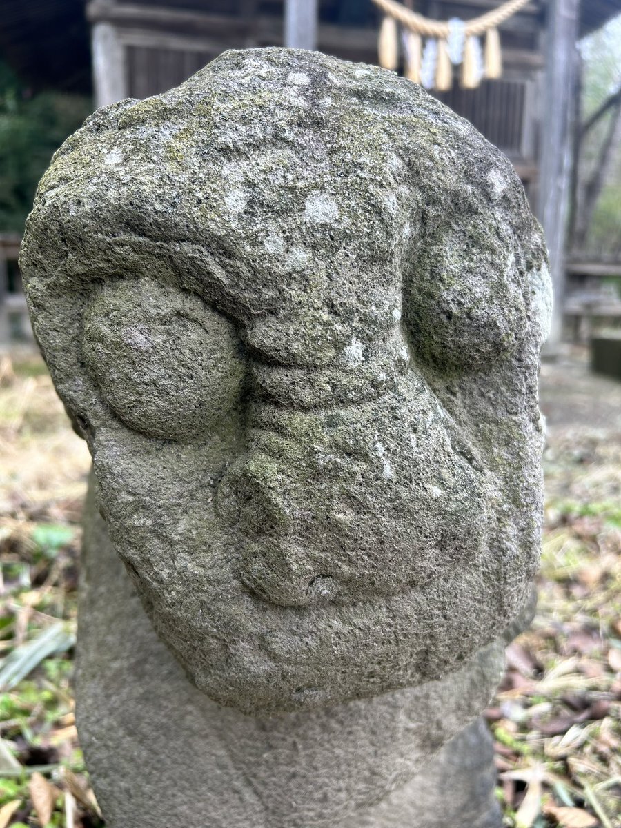 健在なほうの狛犬さん。阿像と見てよろしいだろう。両前脚は前後していないけれど、腹の下はくり抜かれていない。耳は垂れて、鬣は髪の毛のよう。ゲジ眉で目は飛び出る。身をスックと立てるけれど、前傾姿勢でも胸を張るでもないお姿は、仙台狛犬っぽいと見える。 #今日のいしぶみ pic.x.com/DqyFE8rvuY