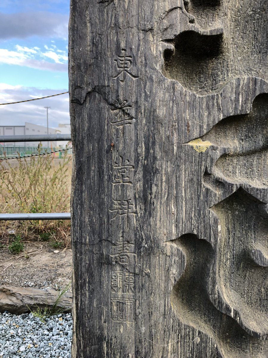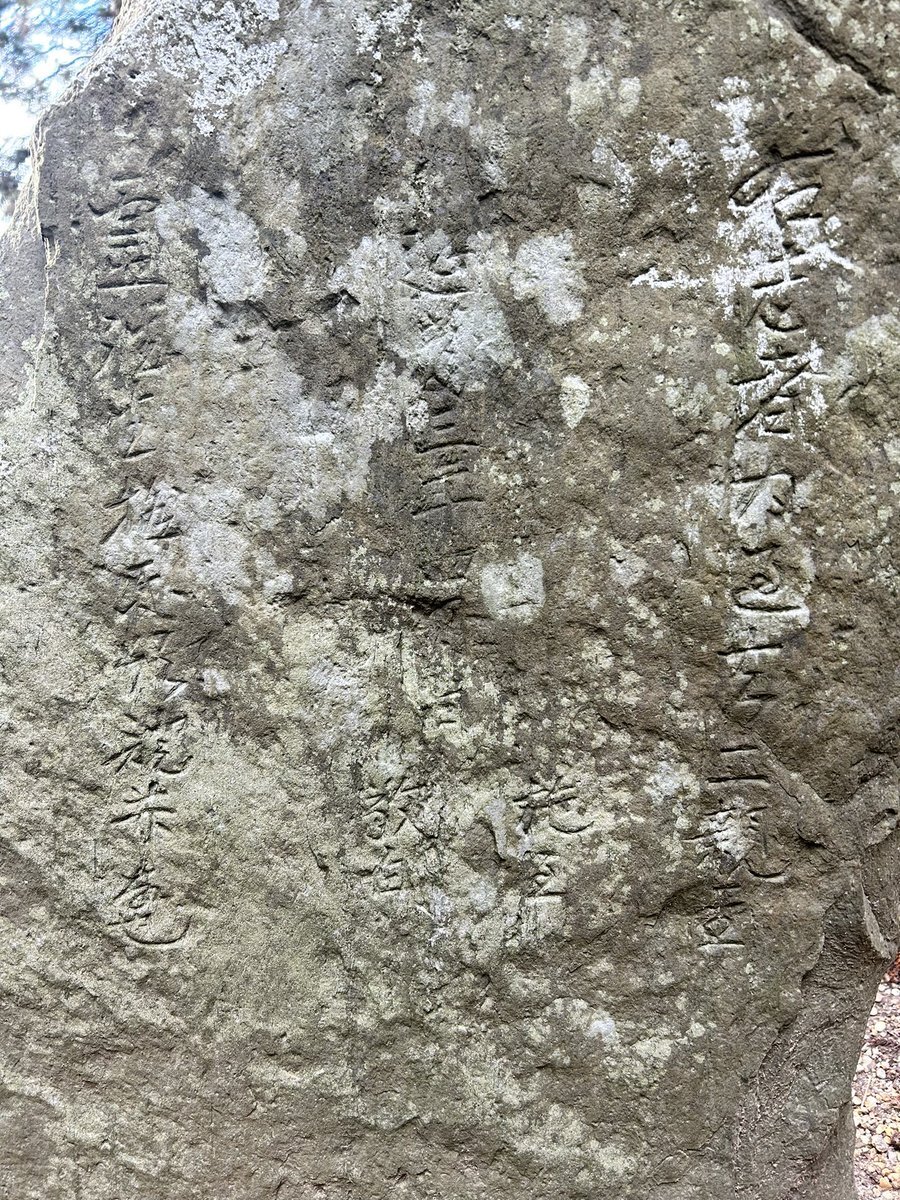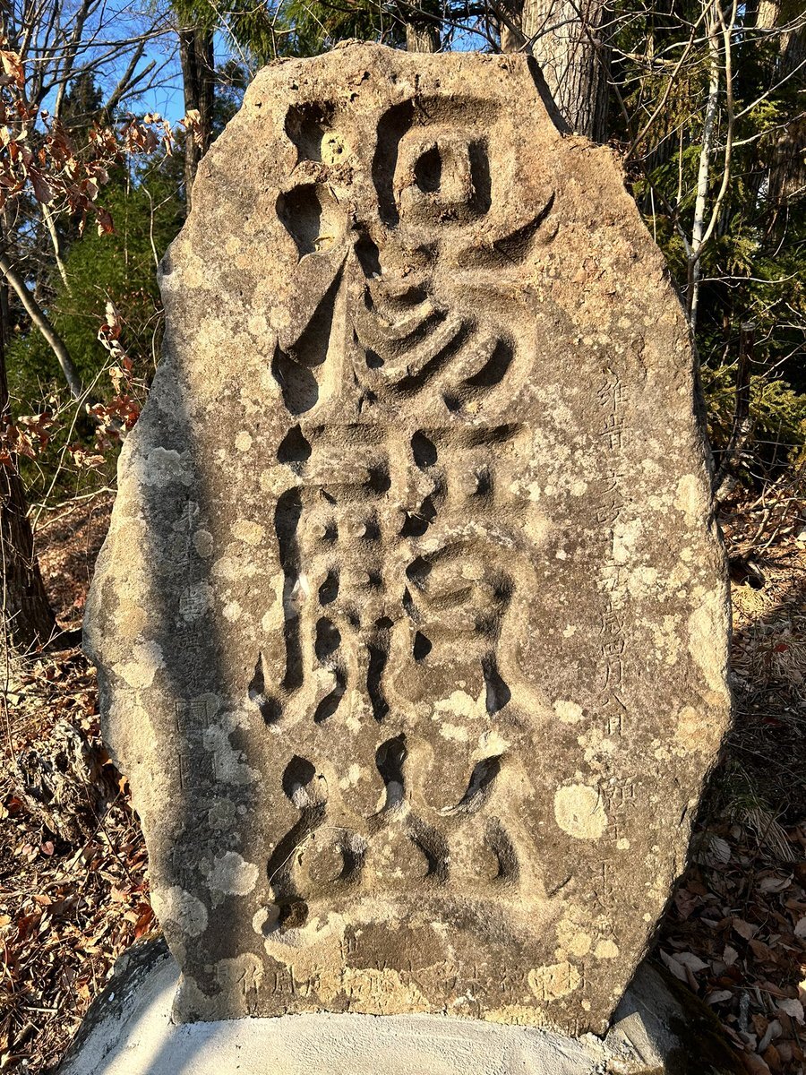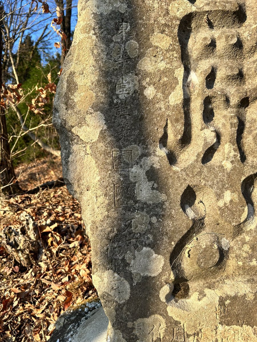 眠気には勝てなかった続き。上下掲に挙げたのは、仙台市宮城野区蒲生・高砂神社の文政十年銘不動尊塔(1827)。極太の筆画で力強く刻まれた主銘「不動尊」が特徴で、境内に多く立ち並ぶ石塔の中でも一発で目立つ。この独特な書を手かげたのは、刻銘によると「東華堂」という書家らしい。 #今日のいしぶみ pic.x.com/HaYKyWihb0
