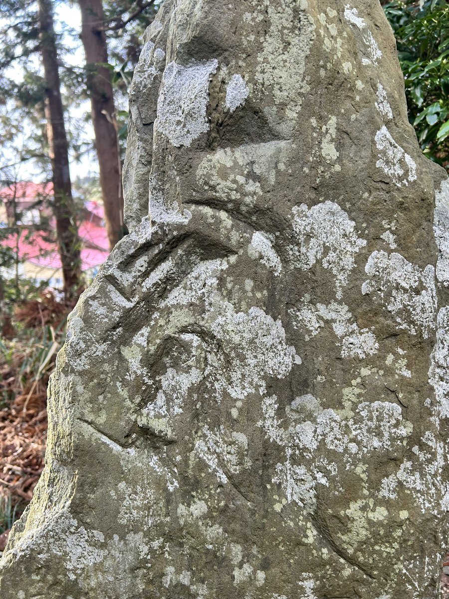 もう一基。損壊が激しいけれど、特徴的なお顔は残っている。太眉と繋がったぶっとい鼻っ柱に、丸く彫り出されて爛々と光る両目。控えめだけれど、パンチパーマっぽくもある鬣は、仙台狛犬の古手のものと似ているような気もする。姿勢は先の狛犬さんと同じだろう。刻銘は見られない。 #今日のいしぶみ pic.x.com/XQUV2OUyBm