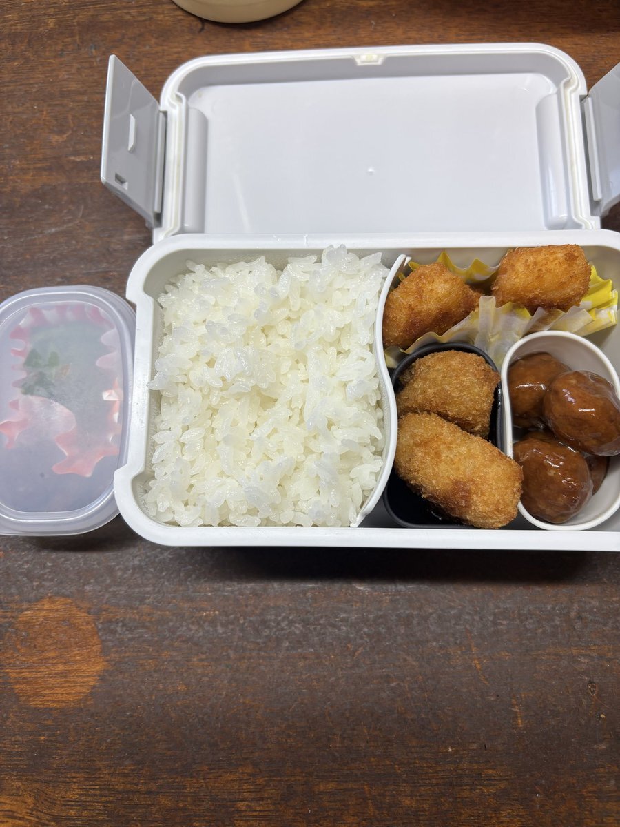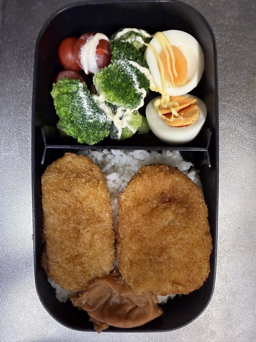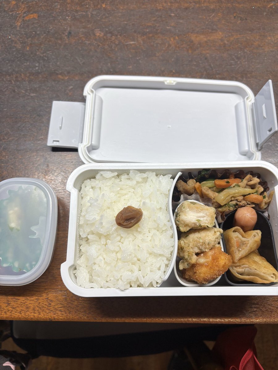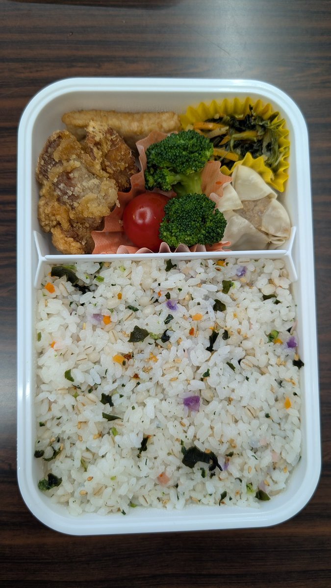 雨☔だけど、歩く時間帯には降られない、不思議 朝、撮り忘れて、食べる直前に気付いて撮った一枚 唐揚げ、肉どうふ、白身魚のフライ、青海苔ポテト、ブロッコリー🥦に漬物 #今日の弁当 #いつかの弁当 pic.x.com/YD8BBnyudY