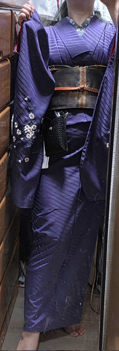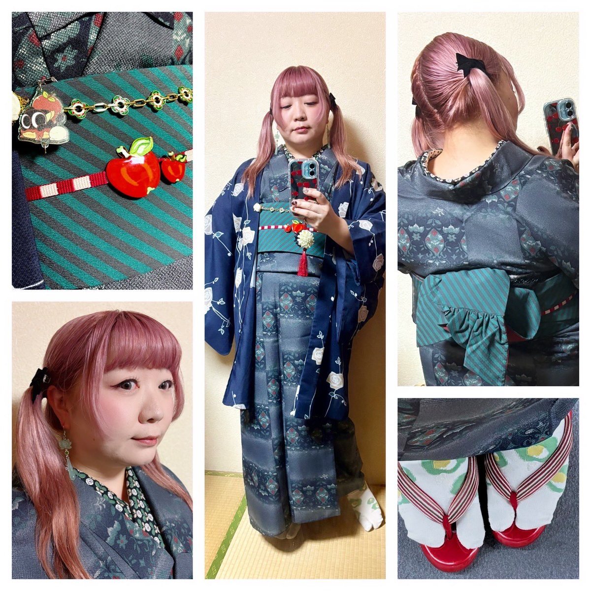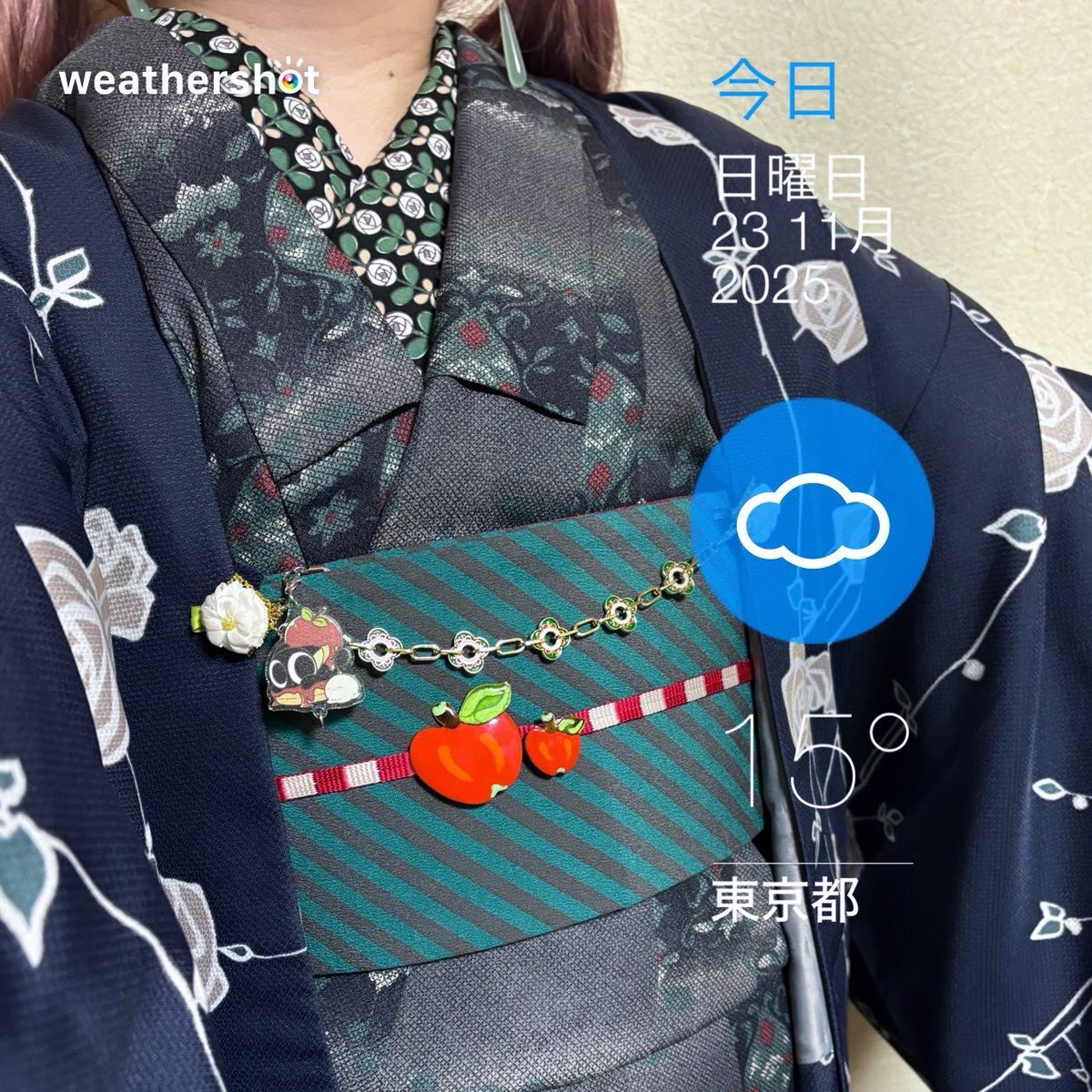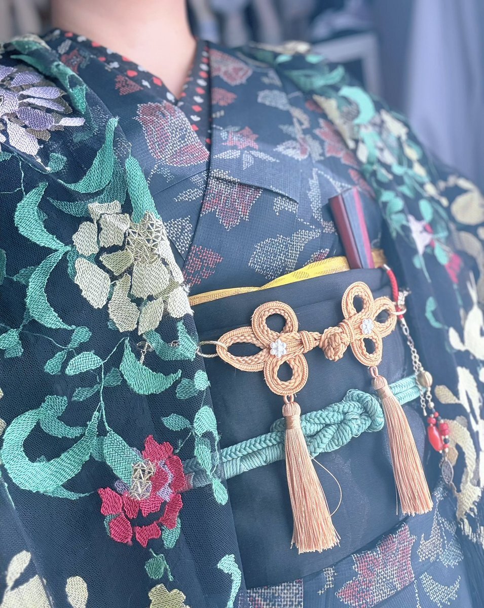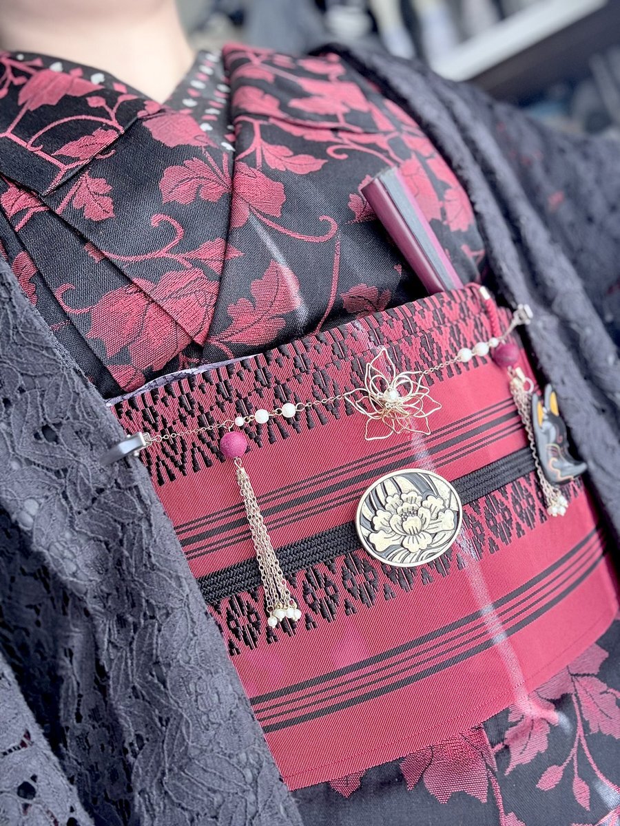 #今日の着物 オリエンタル ポリ #着物 に斜めストライプ半幅帯をパタパタ結び。紺 薔薇 羽織。 ꫛꫀꪝ着物 キモノセンエン 帯・りんごブローチ 骨董市 三分紐 #kimonotento 羽織 京都きもの町 羽織紐クリップ #菫コルセット リボンクリップ・ピアス🪷羽織紐 SHEIN 根付 小黒🐈⬛🍎 羅小黒戦記2観た日 pic.x.com/SJuAMjNANy