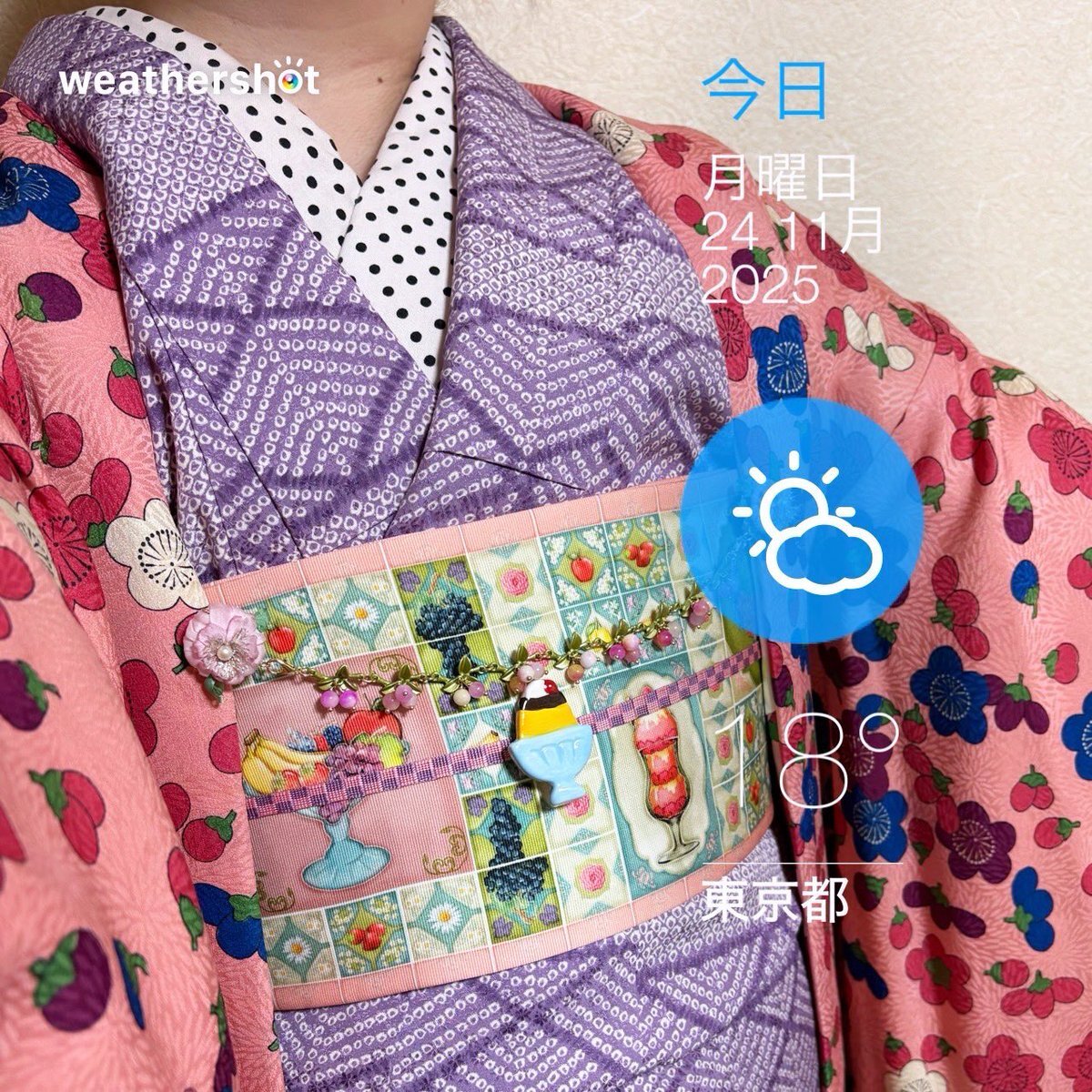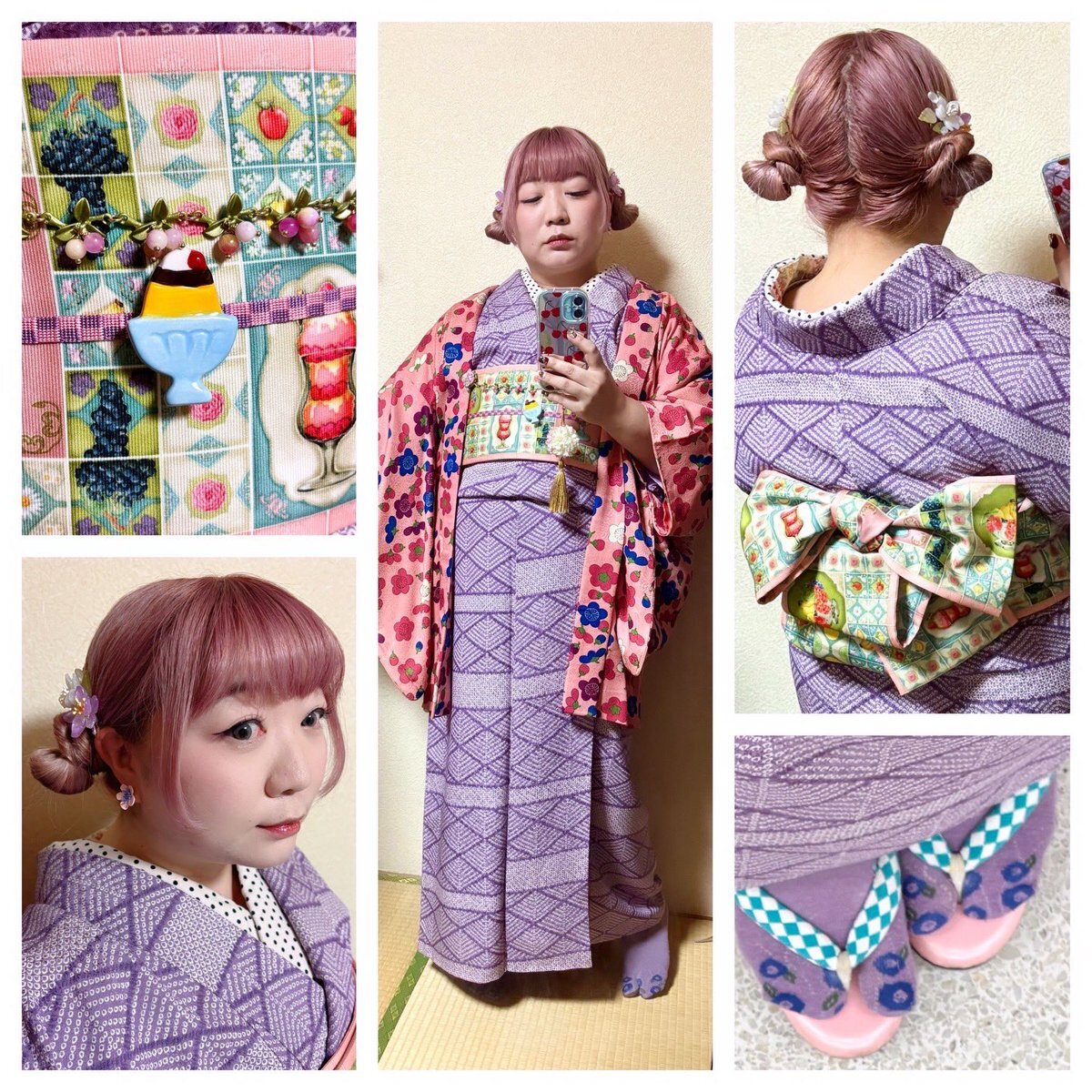 #今日の着物 絞り模様 #着物 にマジョリカタイルフルーツパフェ半幅帯をリボンパタパタ結び。梅ナス 羽織。 着物 タカジさんから 帯 #theaterinvi 帯留🍮 ナチュラルキッチン箸置きリメイク 羽織 ウキョウさんから 羽織紐クリップ #菫コルセット 羽織紐・ヘアクリップ SHEIN ピアス ABAB pic.x.com/EJTfwcF3bF