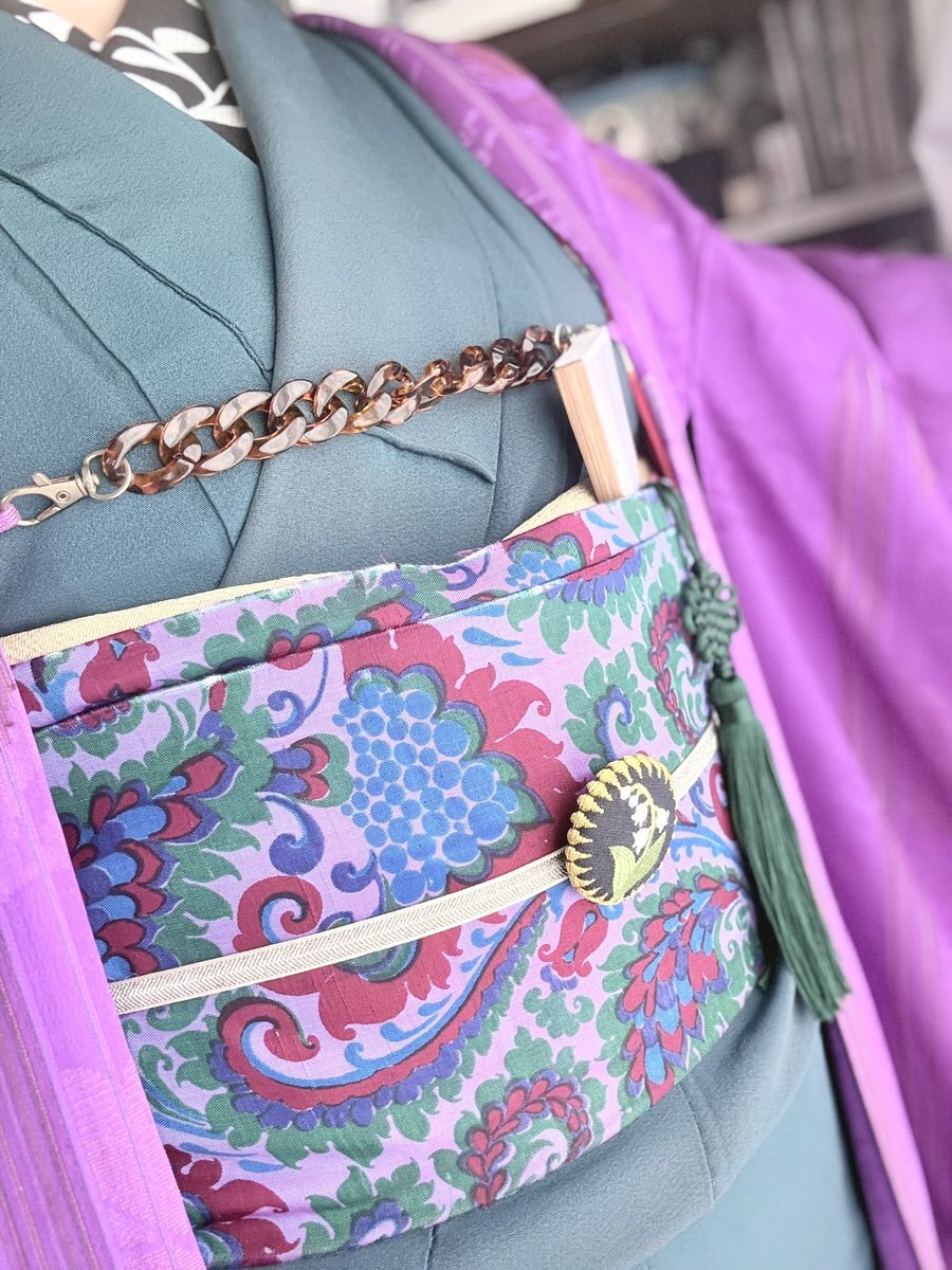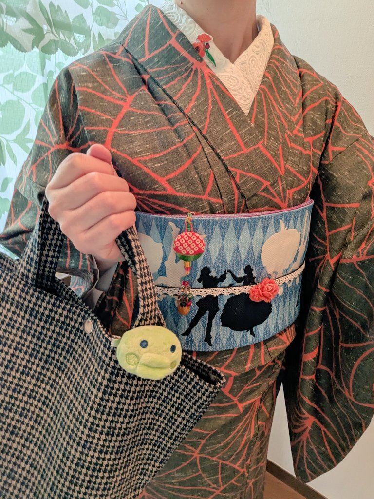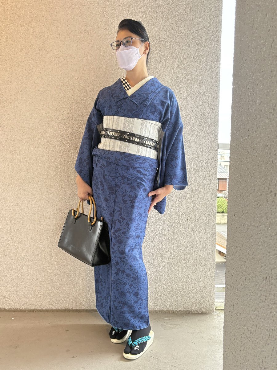 #今日の着物 はシンプルなウール着物に薔薇柄のファブリック帯を合わせました。リボンバッグは #gotocopan さん。 #湖晴屋 作品は #うそつき衿 と帯、帯締め pic.x.com/HW9zhzkMJG