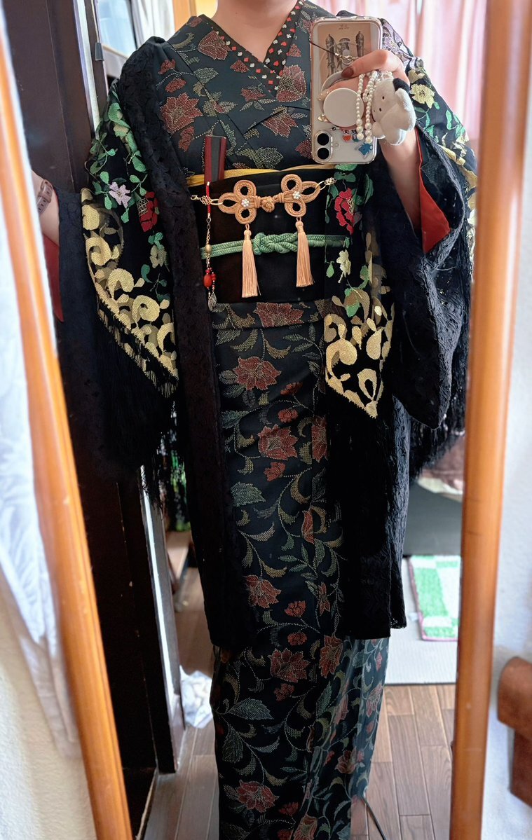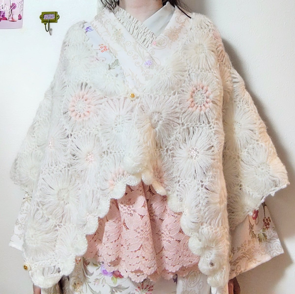 ●ニットケープ→姉妹屋 ●着物、帯→MIKI SAKURA ●半襟→YORUnoMORI ●ゴムベルト→shalanra ●ヘッドドレス→yuminique ●草履→大塚呉服店 ●バッグ→MIUMIU #今日の着物 pic.x.com/9NIkBXHIht