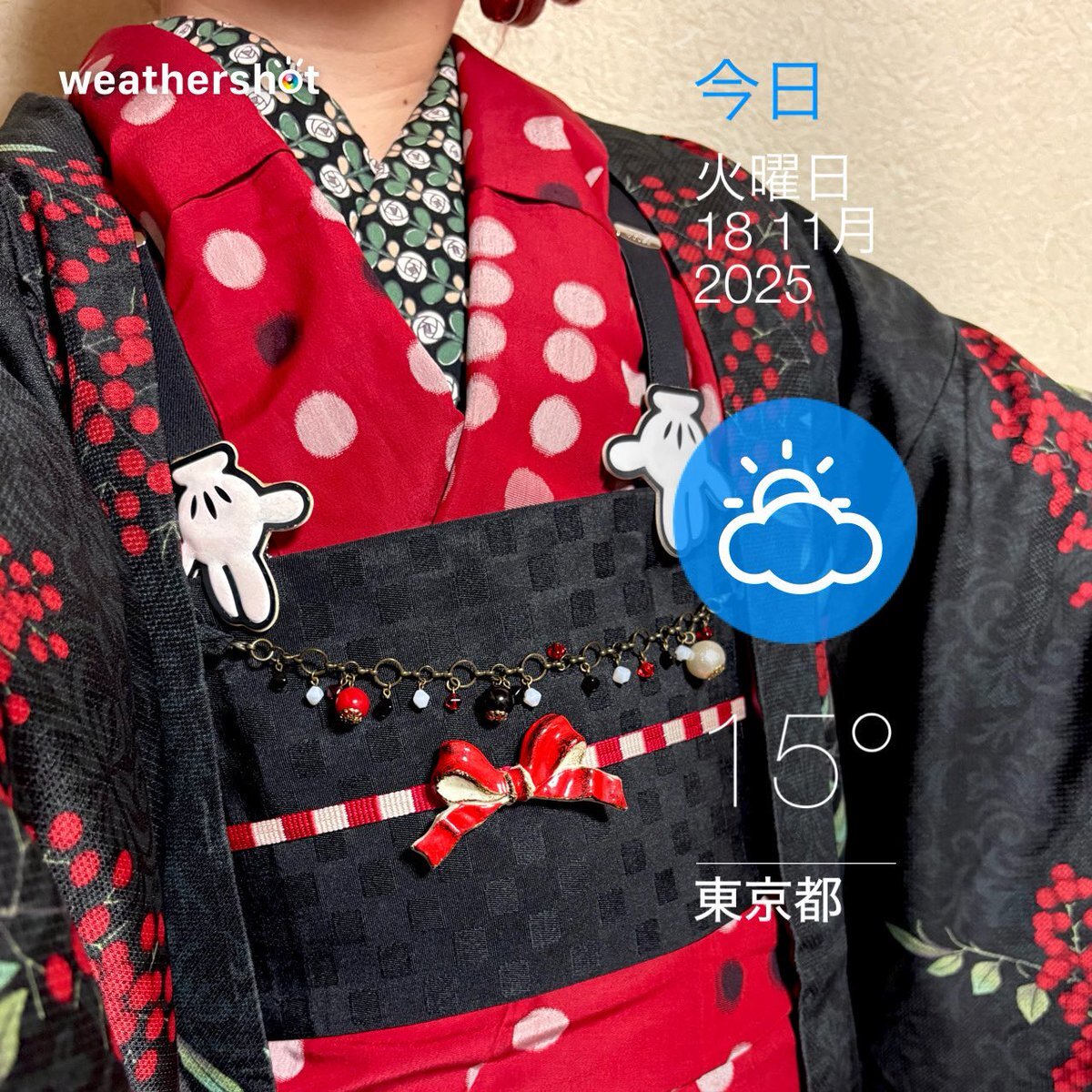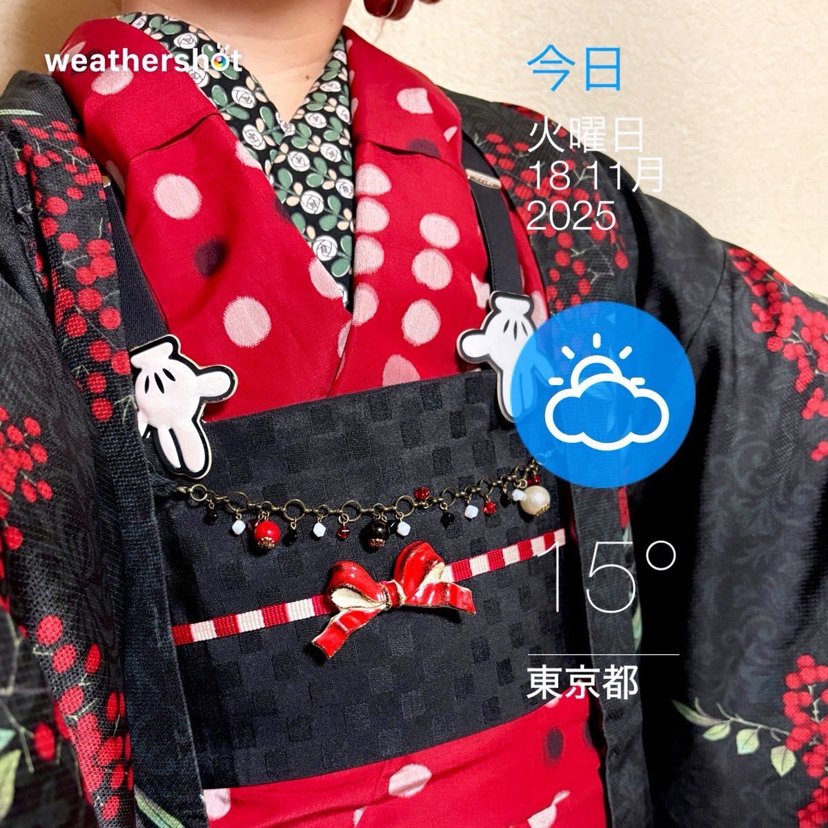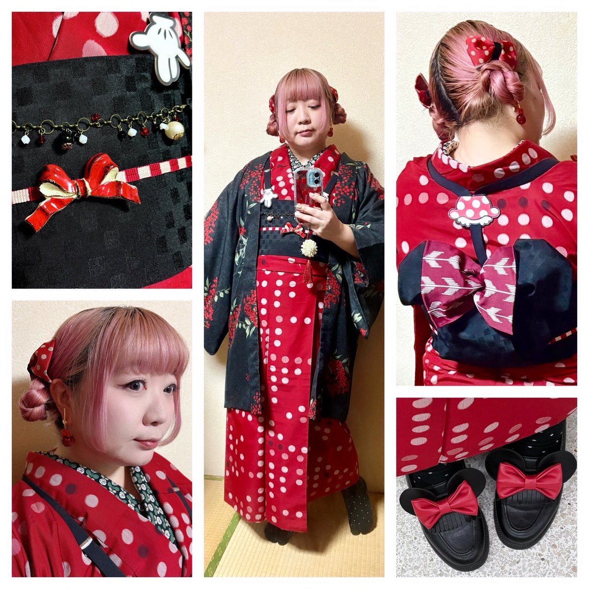 #今日の着物 赤 水玉 #アンティーク着物 に黒半幅帯をミニーちゃん結び。南天 羽織。 #着物 MEGAたんす屋 ꫛꫀꪝ帯 楽天 三分紐 #kimonotento 帯留🎀 #latelierBonBon 羽織 京都きもの町 羽織紐 #Kimono163 ヘアリボン 自作 ピアス🍒 Liquem サスペンダー ディズニー 靴 ABCマート×Areeam 🎂 pic.x.com/6NQZRkbMzh x.com/angel_hinabun/…