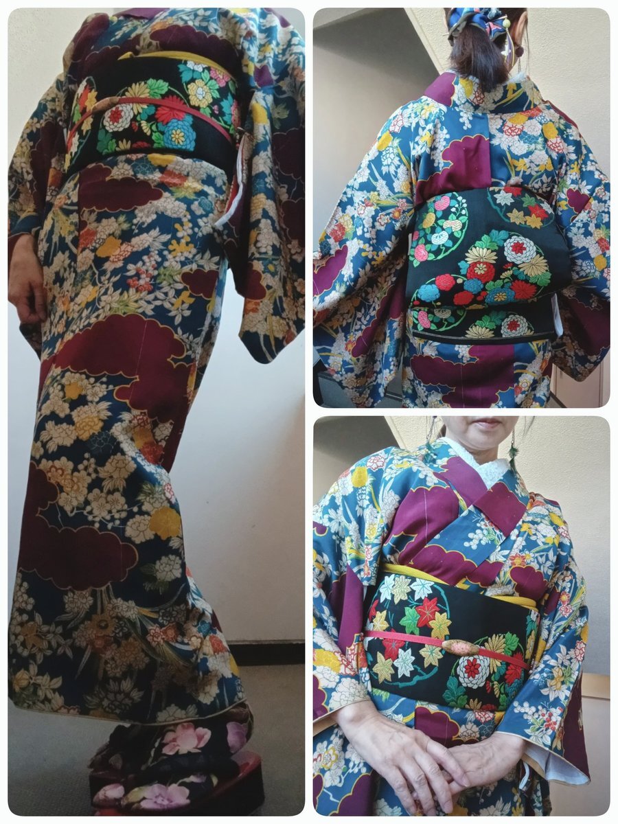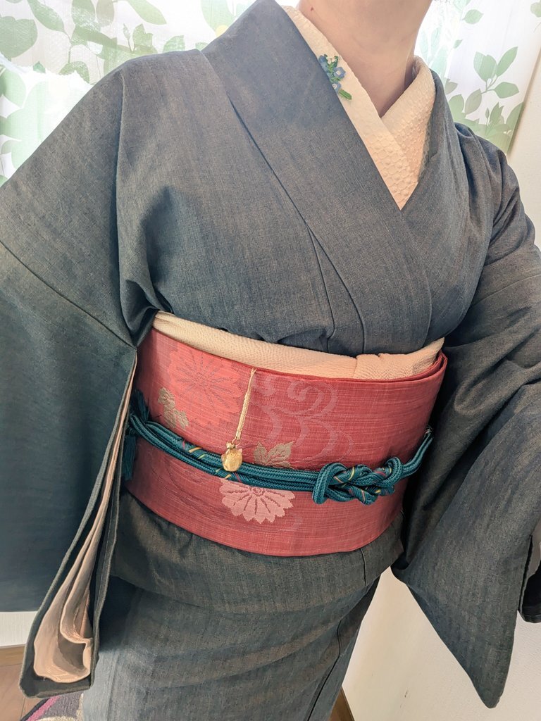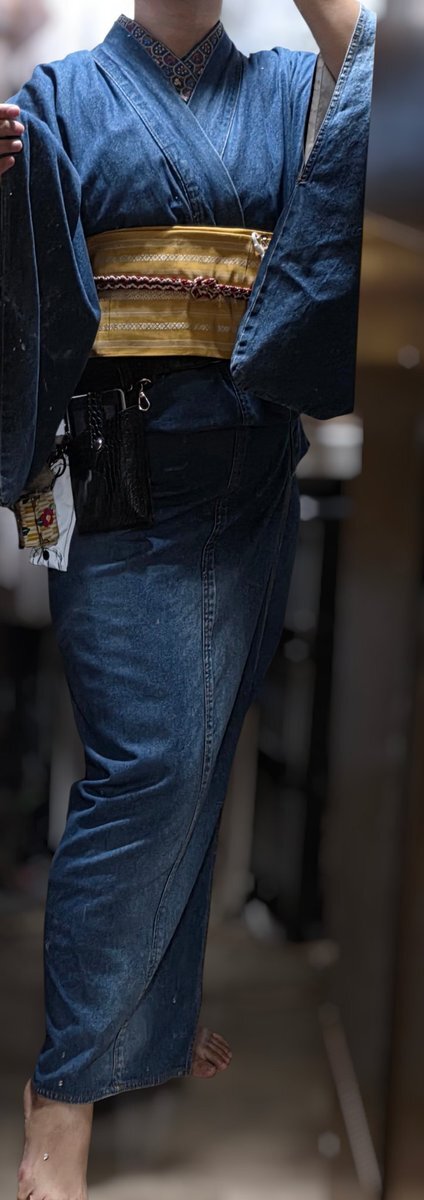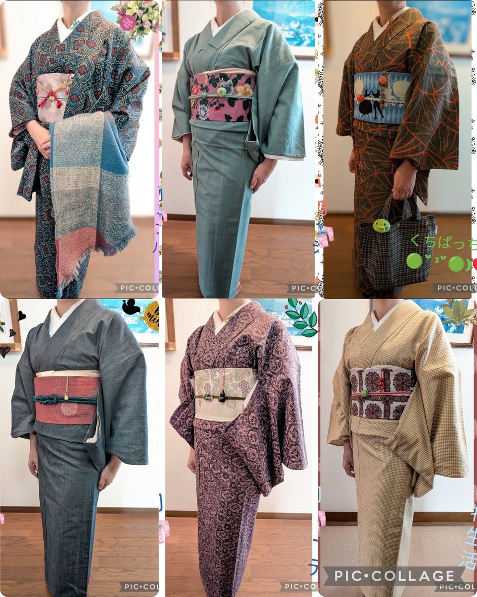 着物コラージュ👘 紬のような風合い #今日の着物 #着物コーデ #おうち着物 お品書き デニム着物(くるり) 名古屋帯 水引細工根付(自作) ガラス根付🐱 ↹左写真反転 pic.x.com/Kw77lNXPWu