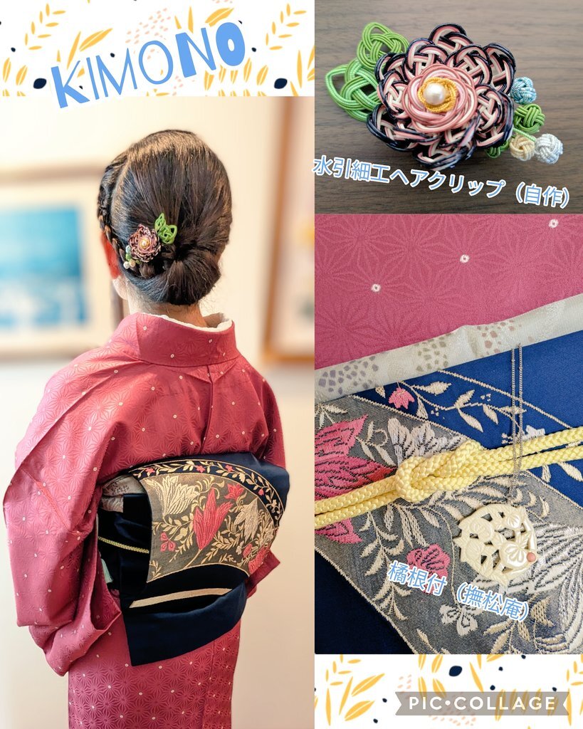 長着はお譲りが決まってますのでラスト着用 着物コラージュ👘 #今日の着物 #着物コーデ #きものくらぶ お品書き 小紋 名古屋帯 水引ヘアクリップ(自作) 橘根付(撫松庵) pic.x.com/X2Wgc0XE97