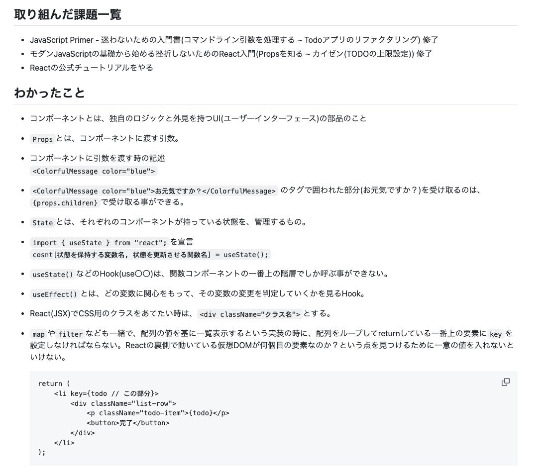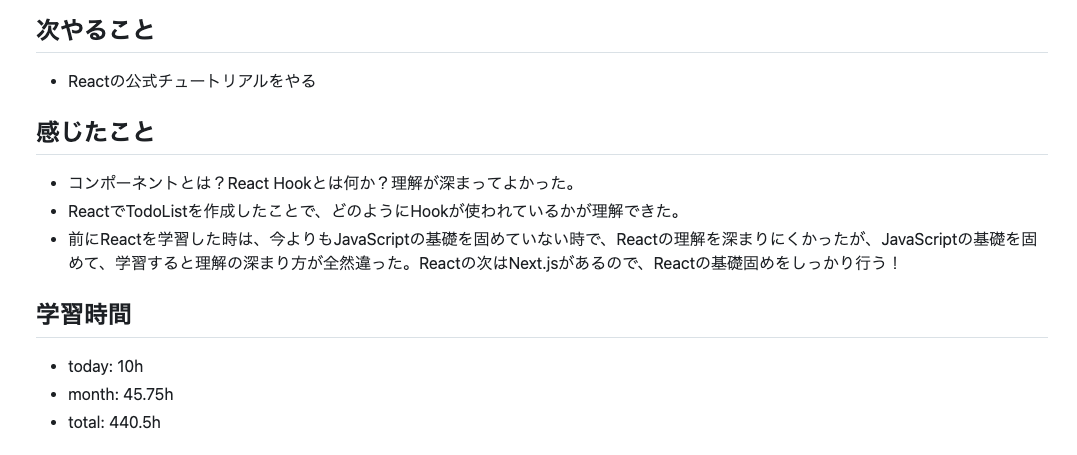 【12/13 学習終了】 JSの基礎をしっかり学習すると、Reactの理解の深まり方が全然違った。Reactの次のステップとしてNext.jsがあるので、このReactの基礎学習がとても重要だと思うので、意識しながら、学習する! today: 10h month: 45.75h total: 440.5h #HappinessChain #今日の積み上げ pic.x.com/Rbrw8gQw6M