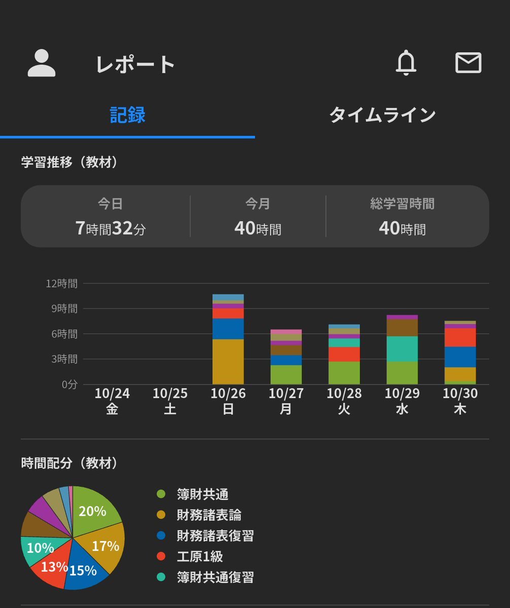 【10/30(木)|7h32m】 🌅前日の復習|22m  ﹂純資産会計 表示 🌄財表理論|1h39m   ﹂純資産会計基準 🌄復習|2h27m   ﹂純資産会計基準 🍱ビジ会3級|23m   ﹂問題集 🚃ビジ法3級|30m  ﹂一問一答 🌃工原1級|2h11m  ﹂労務費会計 #今日の積み上げ #勉強記録 #学習記録 pic.x.com/rFBIWsCT6B