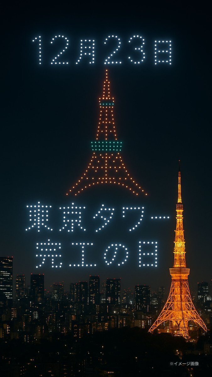 12月23日は「東京タワー完工の日」🗼✨ 1958年、333mの塔が完成。 エッフェル塔より13m高く、日本の電波と都市のシンボルに。正式名称は“日本電波塔”。 #今日は何の日 #東京タワー完工の日 #ドローンショー pic.x.com/mtdxSOzdTU