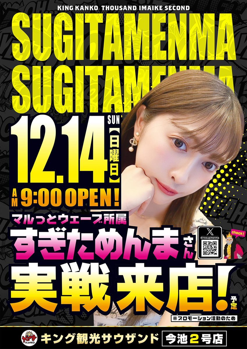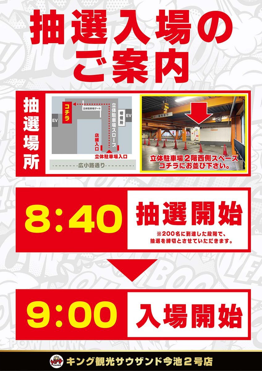 こんばんは🌙 今池2号店です。 👑12月14日(日)👑 👑朝9時開店👑 💕すぎためんまさん実践来店予定💕 @iresugimenma 🎉来店ポイント交換会開催予定🎉 朝は並び替え抽選での 入場となります😀 ご希望のお客様は8:40までに 立駐2Fまでお集まりください👍 #キング観光 #今池 #すぎためんま pic.x.com/7A5jNULktA