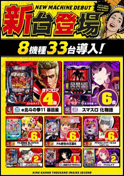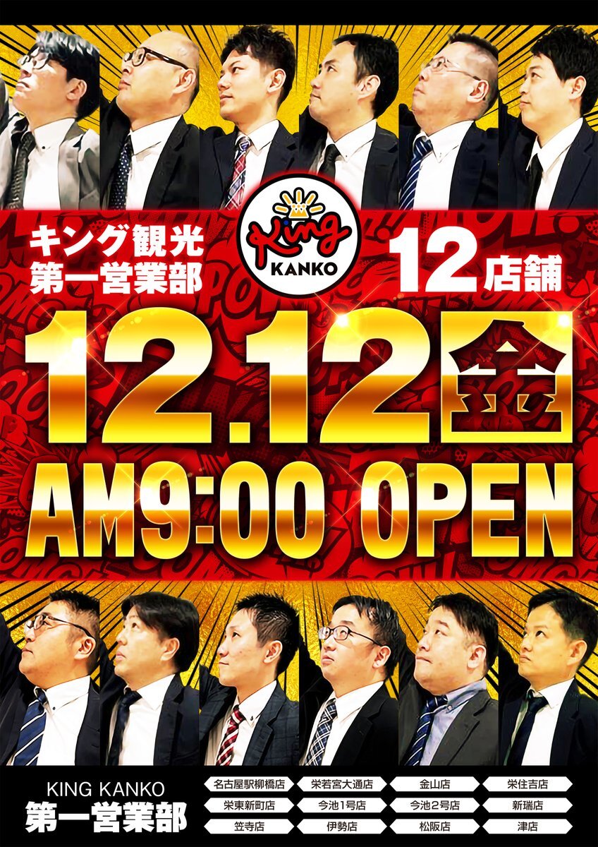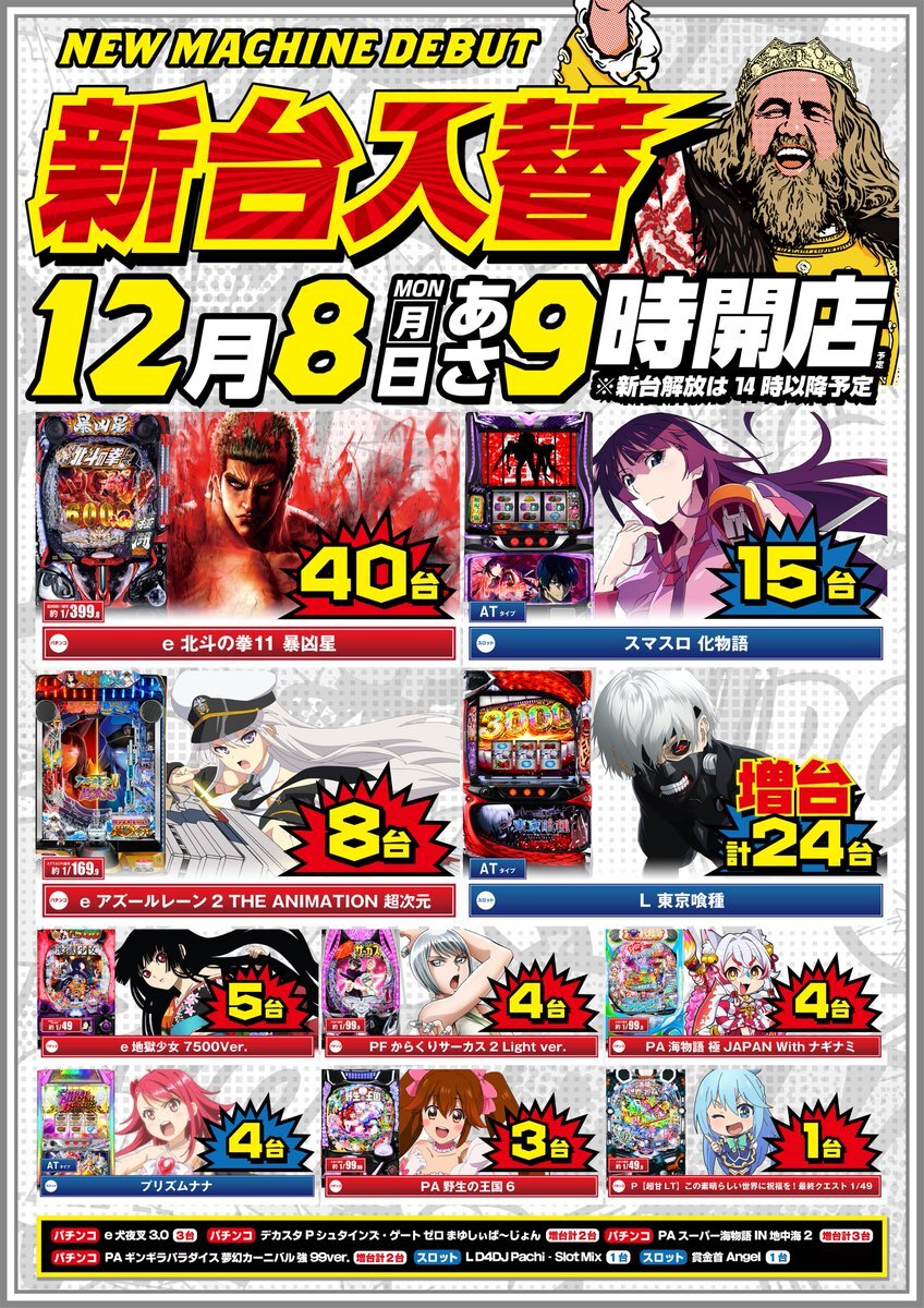 こんばんは🌙 今池2号店です。 👑12月12日(金)👑 👑第一営業部12店舗👑 👑朝9時開店👑 ⭐️新台登場⭐️ 🆕最新機種🆕 e北斗の拳11暴凶星4台 Lスマスロ化物語6台など 8機種33台導入済 朝は並び替え抽選での 入場となります😀 ご希望のお客様は8:40までに 立駐2Fまでお集まりください #キング観光 #今池 pic.x.com/U4obPnKnXb