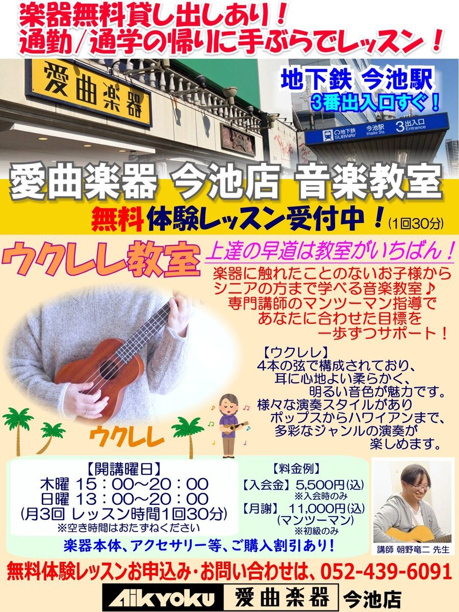 【今池店】 愛曲楽器今池店 音楽教室のご案内 初級向けウクレレ教室を開講中! 楽器に触れたことのないお子様から シニアの方まで学べる音楽教室♪ はじめての方も大歓迎! 無料体験レッスン受付中 お気軽にスタッフまで! #ウクレレ #音楽教室 #今池 pic.x.com/m3Tf9QBjwo