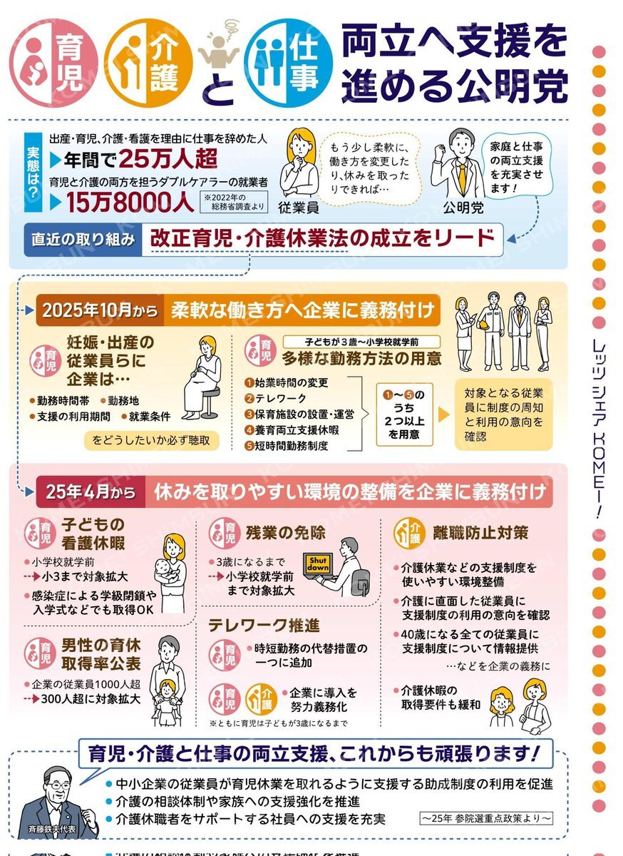 #育児と介護の両立 #子育て支援 #介護支援 #働き方改革 (公明新聞から レッツシェアKOMEI!)育児・介護と仕事、両立へ支援を進める公明党 #公明新聞電子版 2025年10月02日付 komei.or.jp/newspaper-app/ pic.x.com/VUPbTmHtG8