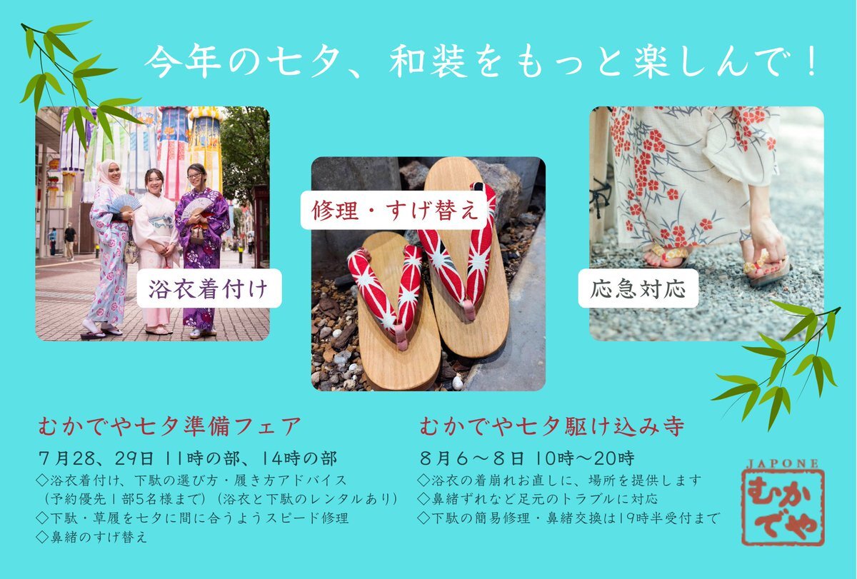 🎋和装で楽しむ仙台七夕👘 「七夕準備フェア」浴衣の着方.下駄の履き方をプロがアドバイス🎐 準備フェア:7/28.29(11時~ 14時~。 予約優先)浴衣持ち込み🙆 駆け込み寺:8/6~8(10:00~20:00) ※鼻緒トラブル.着崩れ対応用「場所のみ」ご提供 📍#むかでや画廊 📞022-223-2063 #仙台七夕 #むかでや pic.x.com/FKP6QkWO89