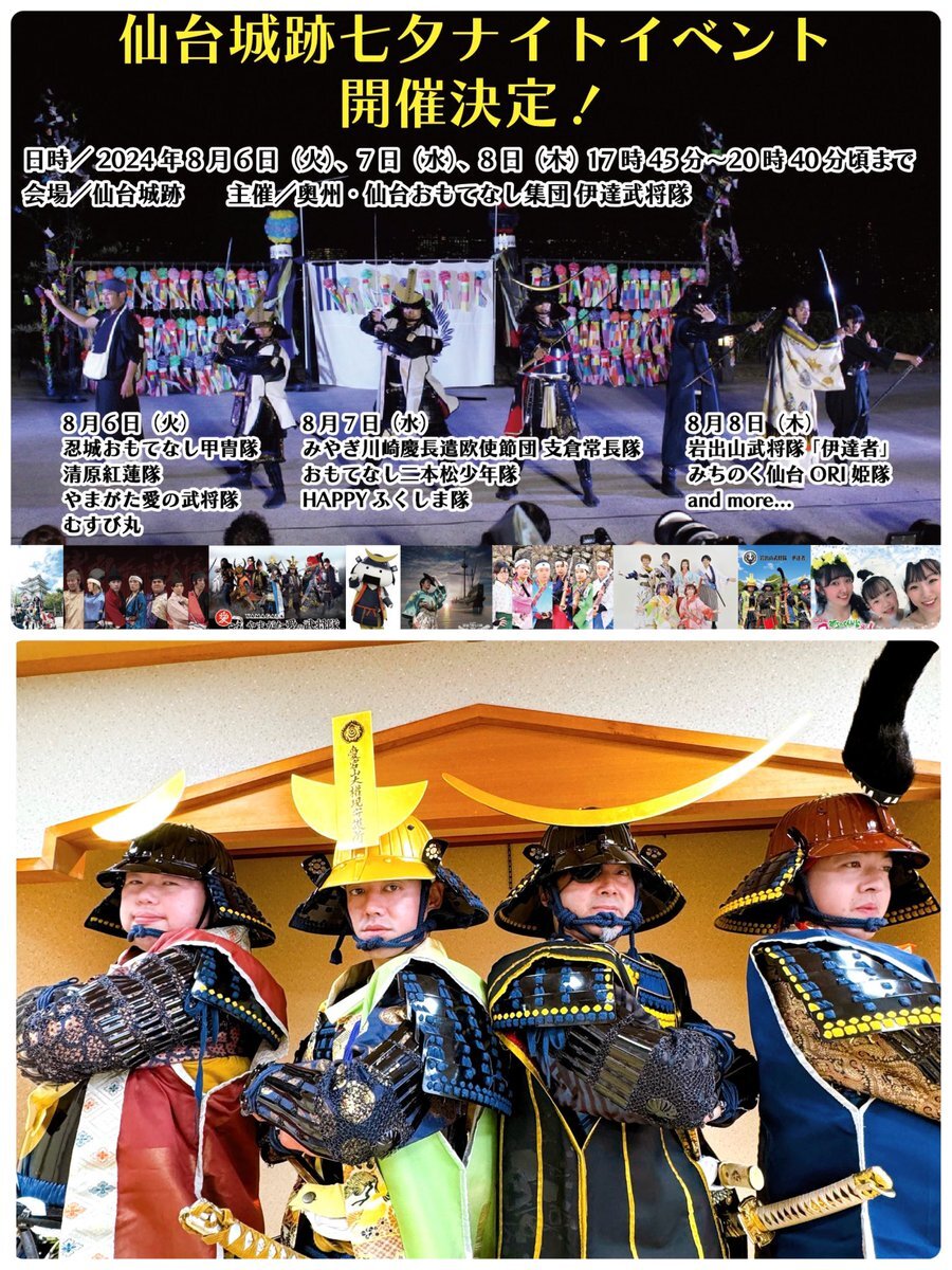 #仙台城跡七夕ナイトイベント 今年もお招き頂き誠に恐悦至極‼️‼️ 我ら出陣は8月8日(木)! 精一杯、大崎市岩出山の魅力を伝えて参る! 応援よろしくお願い致す‼️‼️ #伊達武将隊 #奥州仙台おもてなし集団伊達武将隊 #仙台七夕 #仙台七夕まつり #仙台城 #岩出山 #岩出山武将隊 pic.x.com/YhD0nO3KiK x.com/datebusyou/sta…