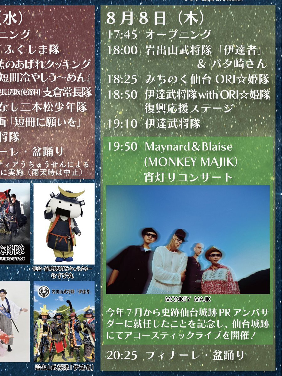 ん? んんんーーー❓❗️❓❗️ 我ら出陣の日に #モンキーマジック ーー😳‼️ キタ━━━(゚∀゚).━━━!!! 皆の笑顔が目に浮かぶ! 何はともあれ 来るしか無しじゃ✊‼️‼️ #仙台城跡七夕ナイトイベント #伊達武将隊 #MONKEYMAJIK #パタ崎さん #仙台七夕 #仙台七夕まつり #岩出山武将隊 #岩出山 pic.x.com/WoXMLwpMTc x.com/datebusyou/sta…