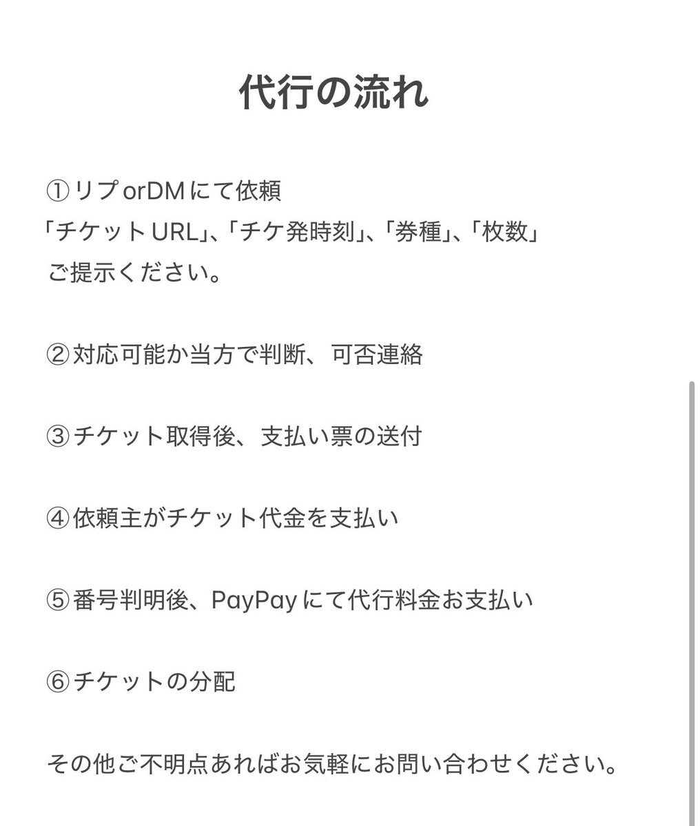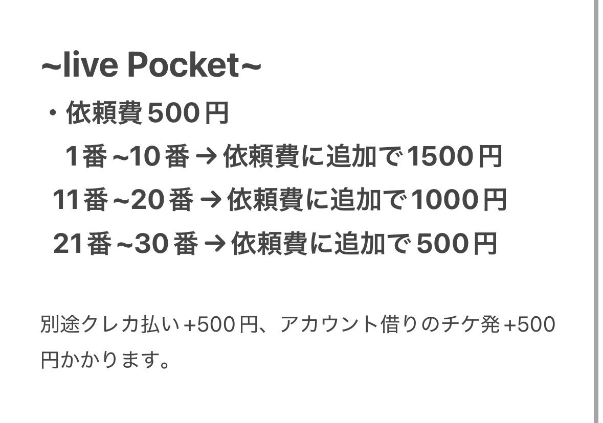 はじめまして、Live Pocket、TIGET、Ticket DIVEにおきまして、チケ発代行させていただいております。 詳細は画像をご確認ください。 ご不明点、質問等ありましたら、 お気軽にDMまたはリプでご相談ください。 #チケ発 #代行 #bot #先着 pic.x.com/RNrwAfefET