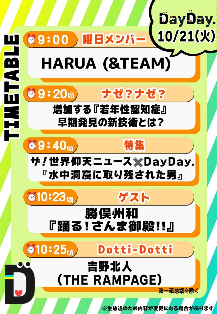\10/21(火)の #DayDay./ ◆ 曜日メンバー 🐰HARUA (&TEAM) #andTEAM @andTEAMofficial ◆ナゼ?ナゼ?🤔 増加する『若年性認知症』 早期発見の新技術とは? ◆特集 ザ!世界 #仰天ニュース × DayDay. 『水中洞窟に取り残された男』 @gyoten_ntv ◆ゲスト 🔥勝俣州和 pic.x.com/lkzkXNy3D2