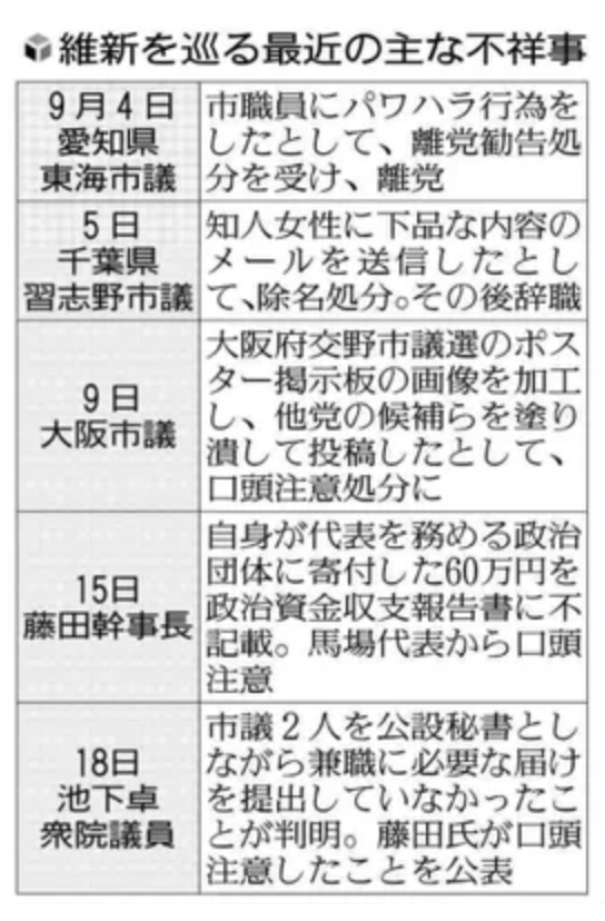 維新の不祥事率7%というのを見かけてそんなまさかさすがに、と検索したら、2023年9月の2週間だけでこんなにあって驚きました(読売新聞)。